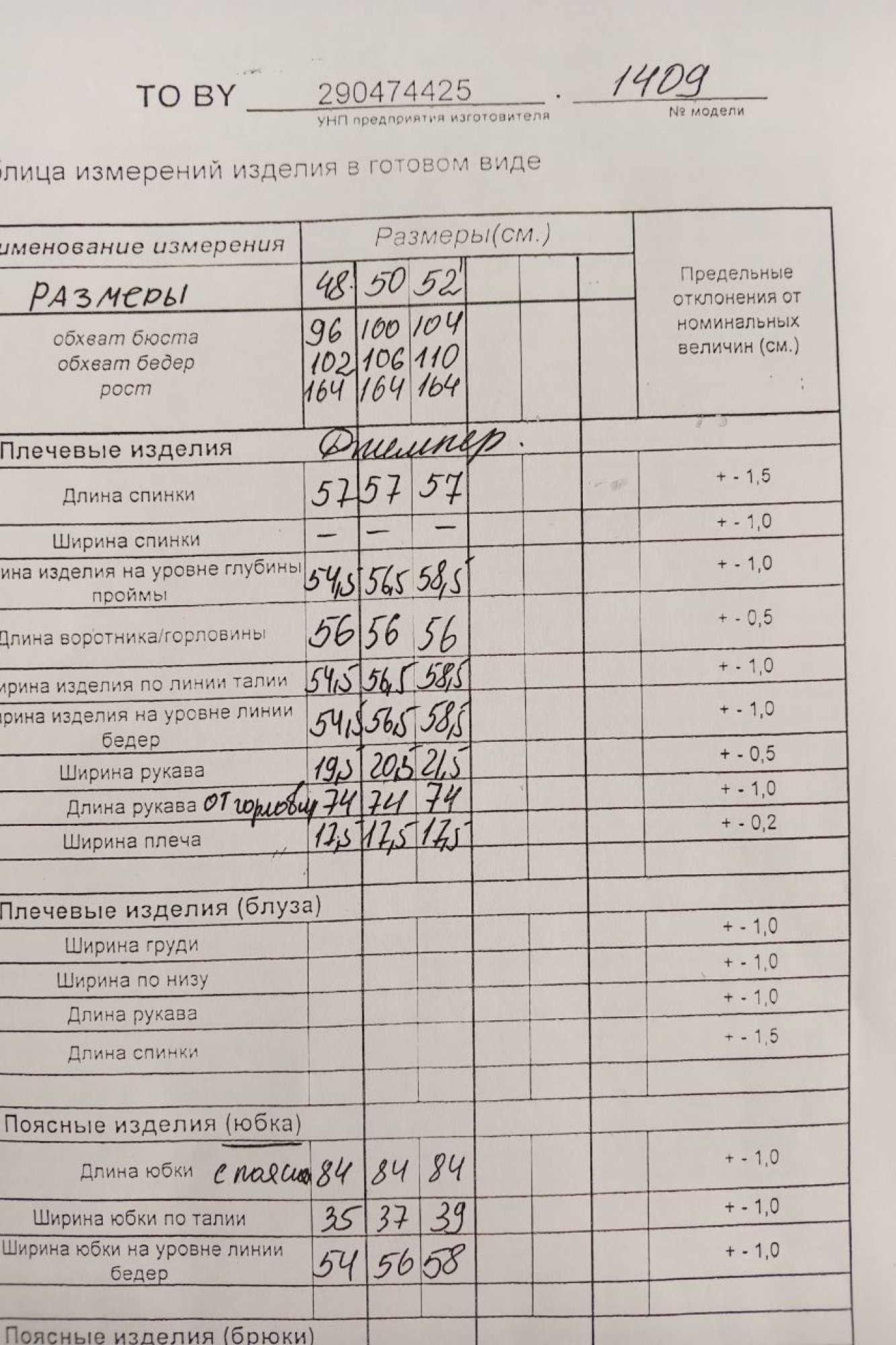 Таблица размеров
