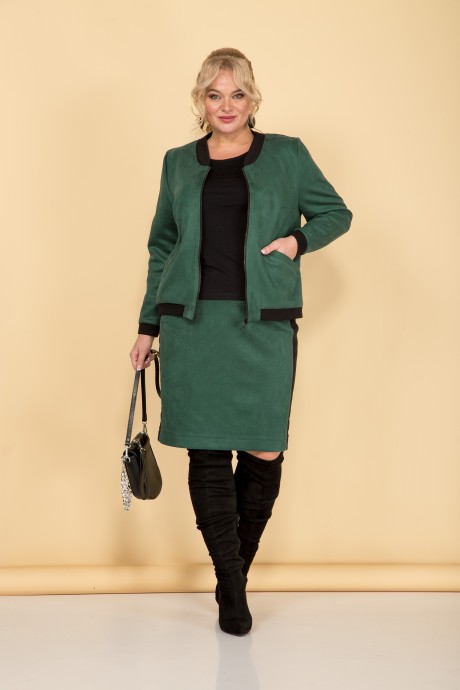 Бомбер и юбка выполнены из бархатистой эко-замши на трикотажной основе. Бомбер на застёжке-молнии. На полочках обработаны нагрудные вытачки и прорезные карманы с листочкой. Рукав втачной, длинный. Низ рукава, горловина и низ бомбера оформлены трикотажным полотном.