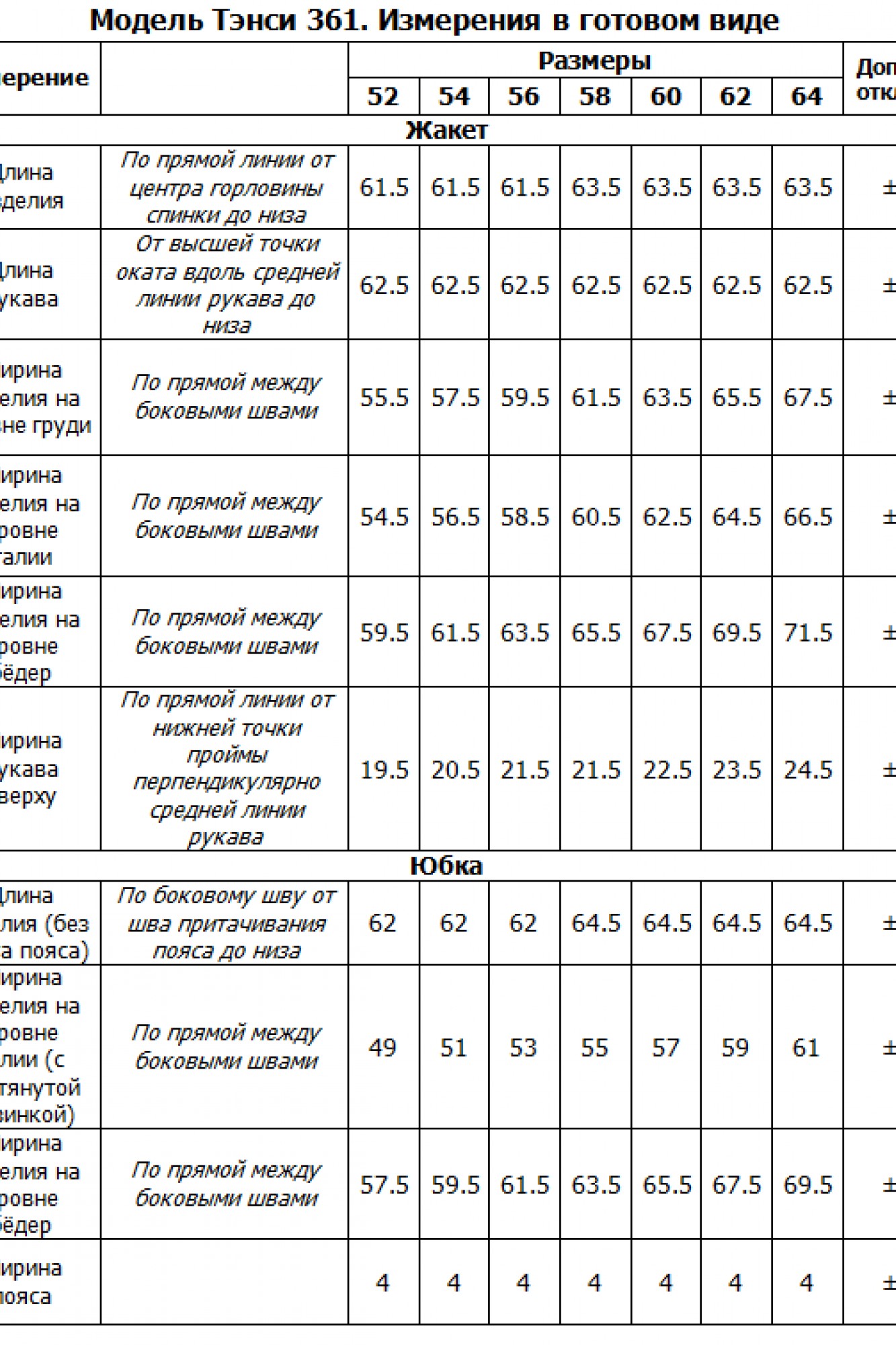 Длина жакета от центра горловины спинки до низа: в 52-56 р-рах — 61,5 см; в 58-64 р-рах — 63,5 см. Длина рукава: 62,5 см. Длина юбки по боковому шву без учёта пояса: в 52-56 р-рах — 62 см; в 58-64 р-рах — 64,5 см.