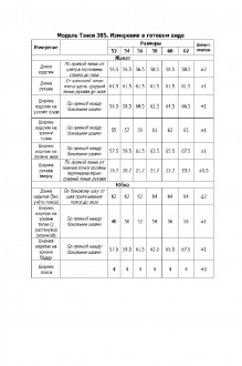 Длина жакета от центра горловины спинки до низа: в 52-56 р-рах — 56,5 см; в 58-62 р-рах — 58,5 см. Длина рукава: 61,5 см. Длина юбки по боковому шву без учёта пояса: в 52-56 р-рах — 62 см; в 58-62 р-рах — 64 см.