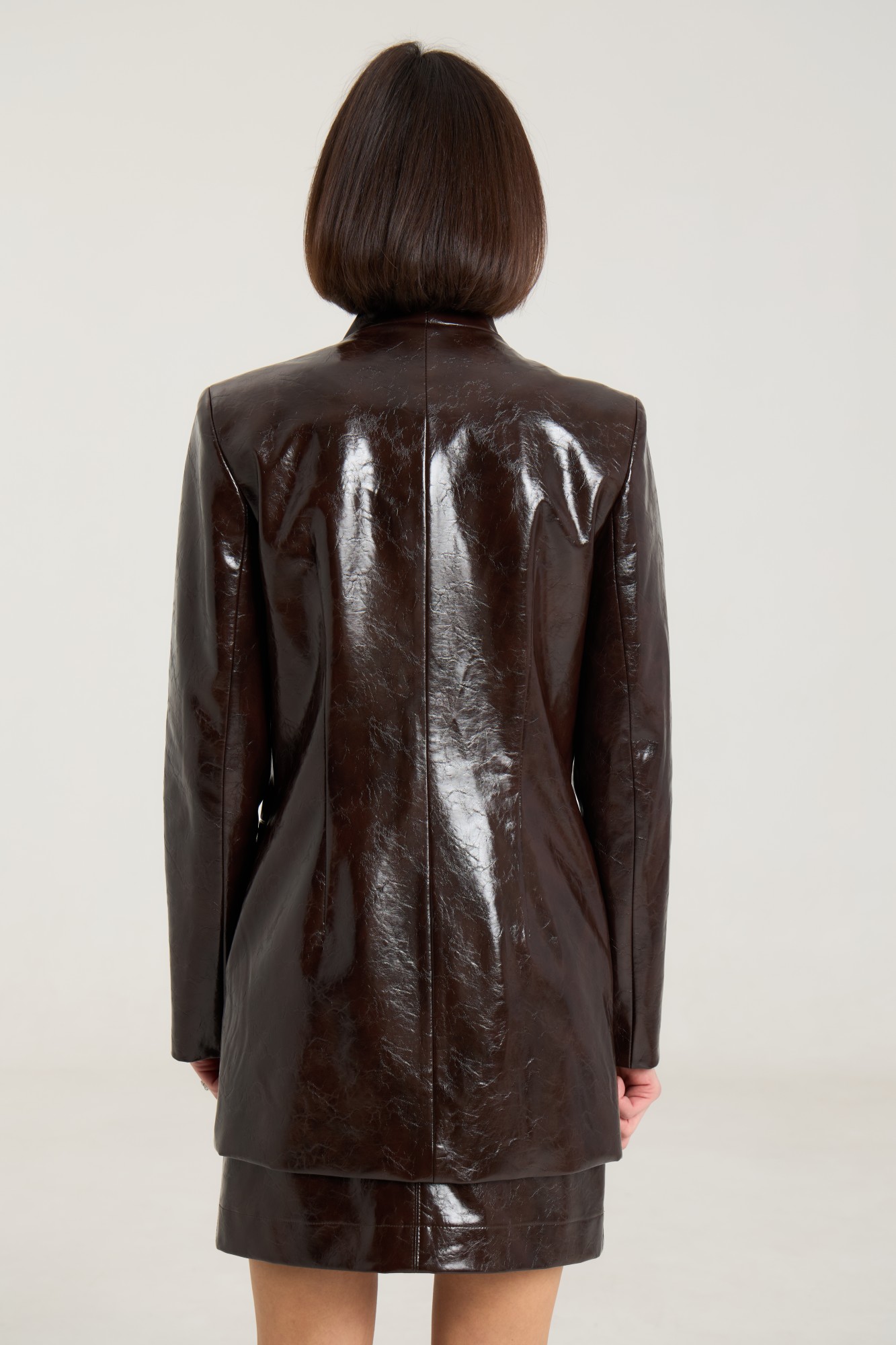 Комплект двухпредметный, состоит из жакета и юбки. Жакет однобортный на одну центральную петлю-пуговицу, на подкладке, полуприлегающего силуэта с прорезными карманами в рамку по переду. Воротник втачной-стойка, рукав двухшовный, спинка жакета разрезная по центру с таллиевыми выточками. Жакет выполнен их плотной лаковой экокожи премиум качества шоколадного цвета. Юбка прилегающего силуэта на притачном поясе, посадка высокая , юбка на подкладке, изделие имеет центральный шов спереди и сзади. В среднем шве застежка на потайную молнию. Юбка выполнена из плотной лаковой экокожи шоколадного цвета.