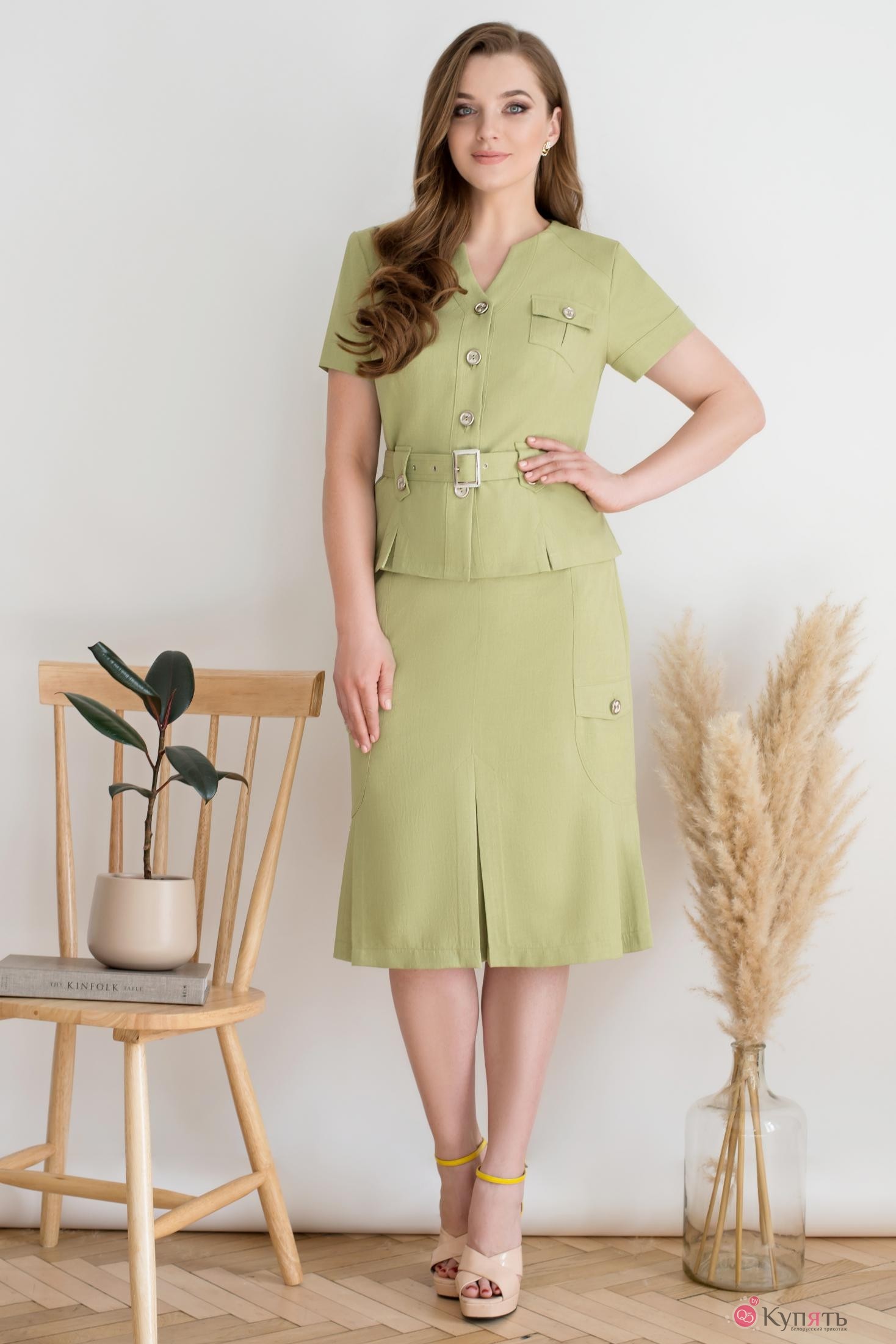 Прекрасный летний костюм, состоящий из жакета и юбки. Этот костюм прекрасно подойдёт как для рабочей обстановки, так и для дружеских встреч. Оригинальное цветовое решение для данного костюма сделает ваш образ оригинальным и интересным. Костюм женский полуприлегающего силуэта из жакета и юбки. Костюм изготовлен в спортивном стиле, с большим количеством отделочных строчек и декоративных элементов. Жакет с центральной бортовой застёжкой планкой на 4 петли и пуговицы. На уровне линии талии расположен застёгивающийся пояс. На уровне линии груди на переде настрочены карманы. Рукав в жакете короткий. Горловина фигурной V-образной формы. Длина жакета до уровня линии бёдер. Юбка длиной чуть ниже уровня линии колена с притачным поясом. Застёжка на потайную тесьму-молнию и петлю и пуговицу в среднем шве спинки. По низу юбки застрочены складки.