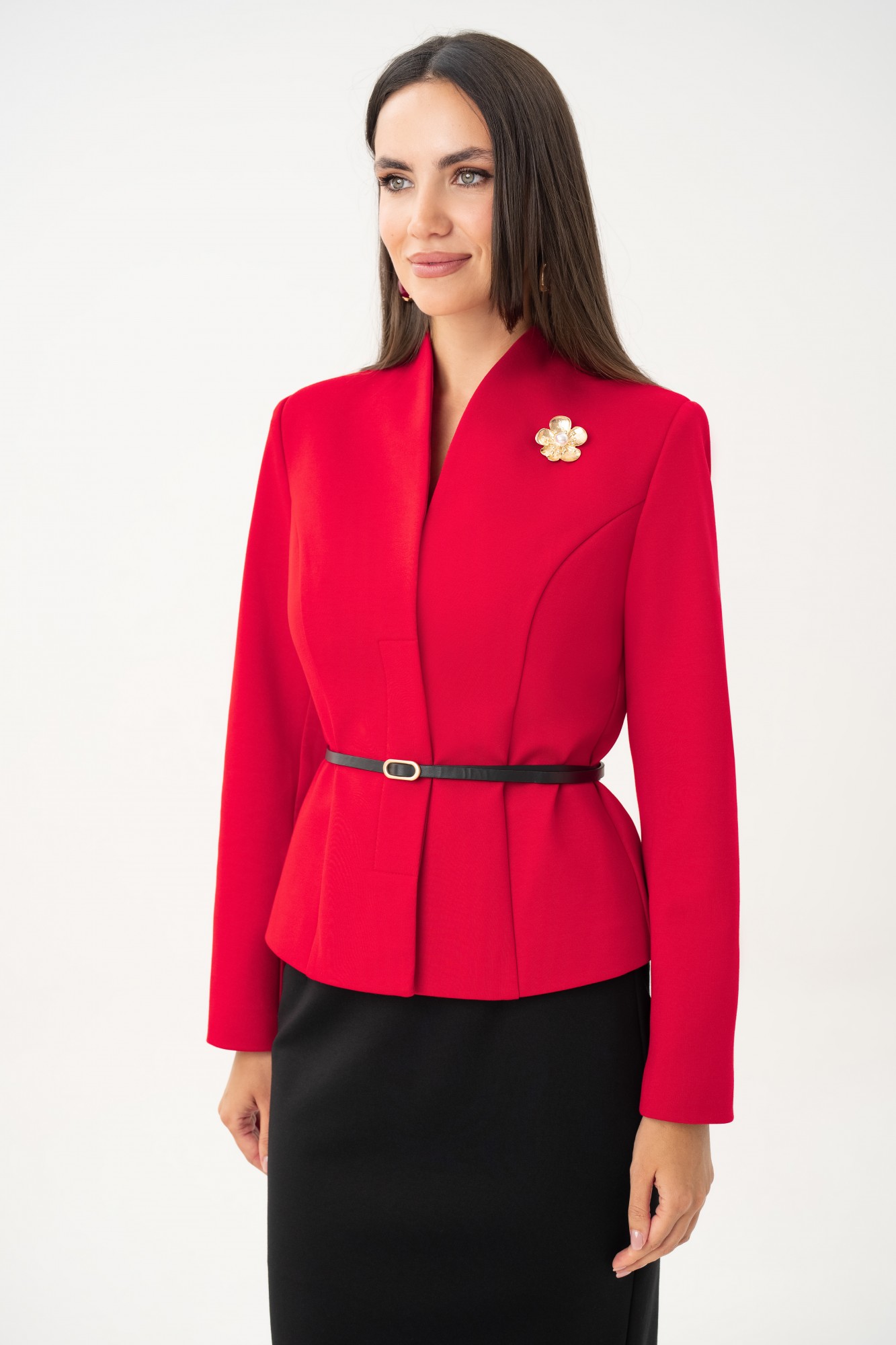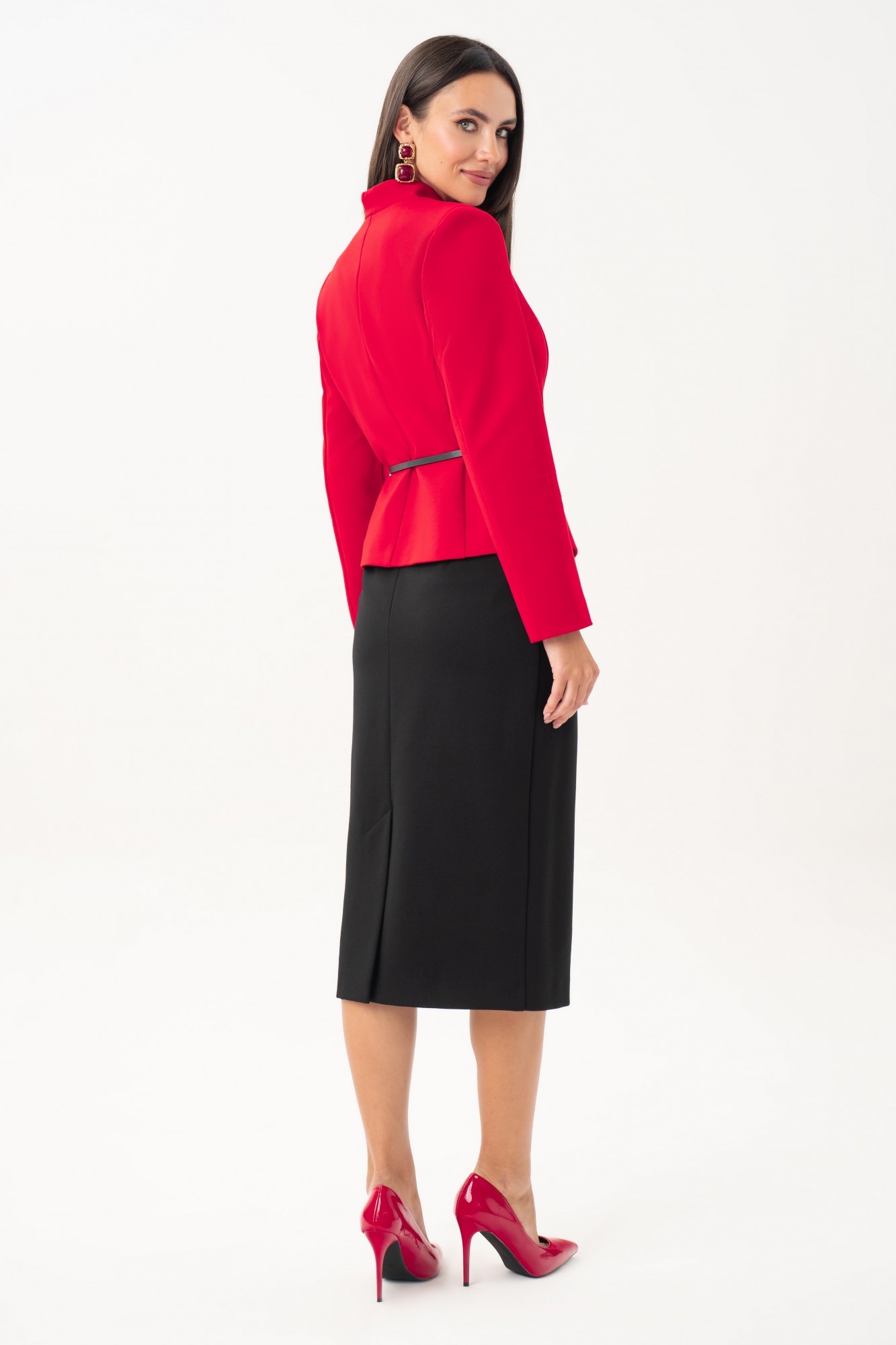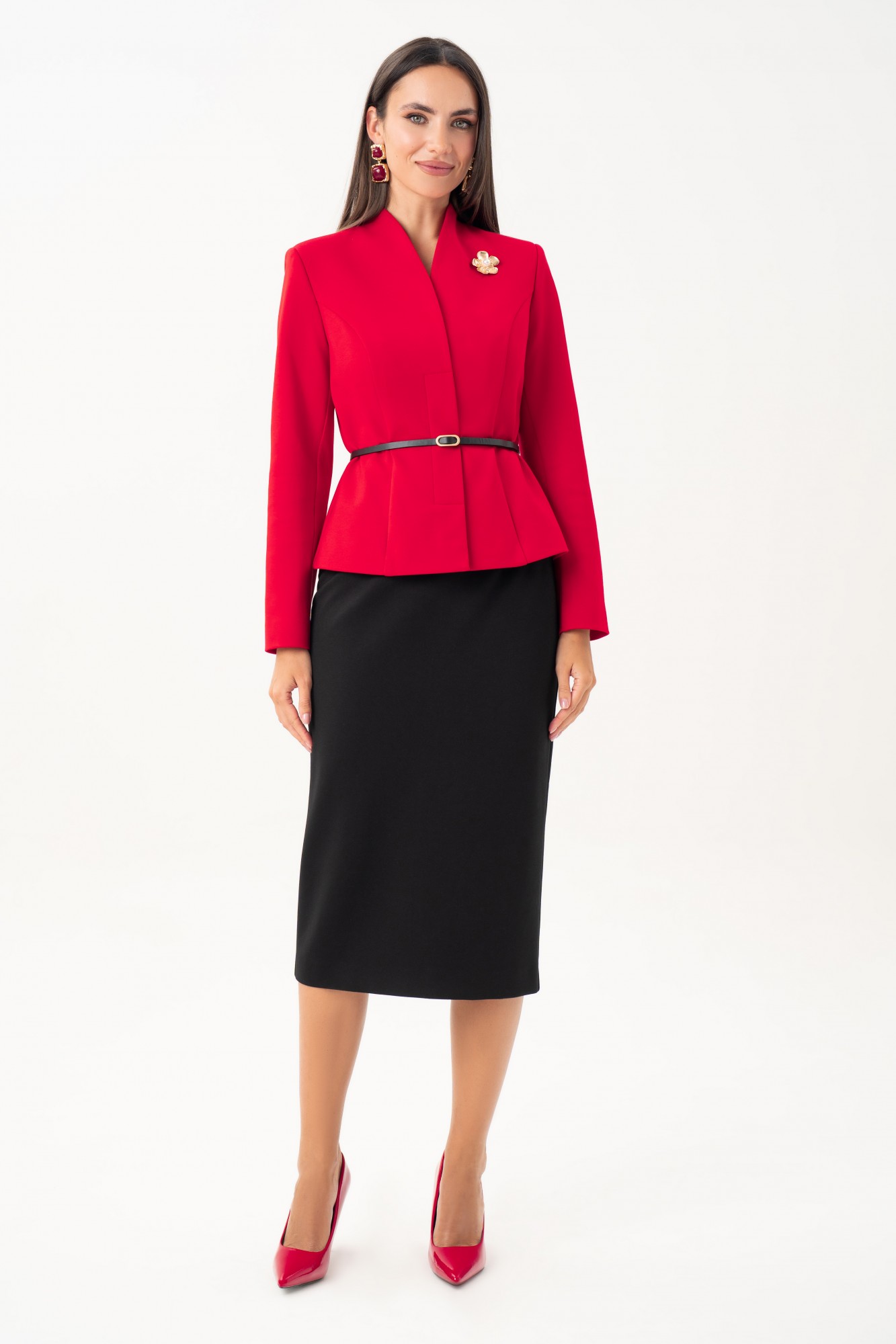 Женский костюм с юбкой URS — это воплощение элегантности, утончённого вкуса и уверенности в себе. Такой деловой костюм с юбкой подойдёт для офиса, переговоров, деловых встреч, конференций, официальных мероприятий. Он сочетает в себе строгость классического силуэта и женственность мягких линий. Костюм женский ЮРС, 2-х предметный, состоящий из жакета и юбки, выполнен из трикотажного полотна, со съемным декоративным поясом, нарядный. Жакет женский полуприлегающего силуэта, на подкладке, с центральной бортовой потайной застежкой на 2 петли и пуговицы (размер и цвет фурнитуры может незначительно отличаться от фото). Перед с рельефными швами. Спинка со средним и рельефными швами. Рукава втачные, двухшовные, длинные. Горловина ˅- образная, переходящая в воротник - стойку по спинке. Жакет с плечевыми накладками. Юбка прямого силуэта, зауженная к низу, на притачном поясе, застегивающимся на 1 петлю и пуговицу. Переднее и заднееполотнища с талиевыми вытачками. Заднее полотнище со средним швом, в верхней части которого обработана застежка на потайную тесьму - молнию, в нижней – шлица. Юбка на отлетной по низу подкладке. С 50 размера в поясе, на уровне боковых швов предусмотрены резинки для лучшего прилегания по талии.