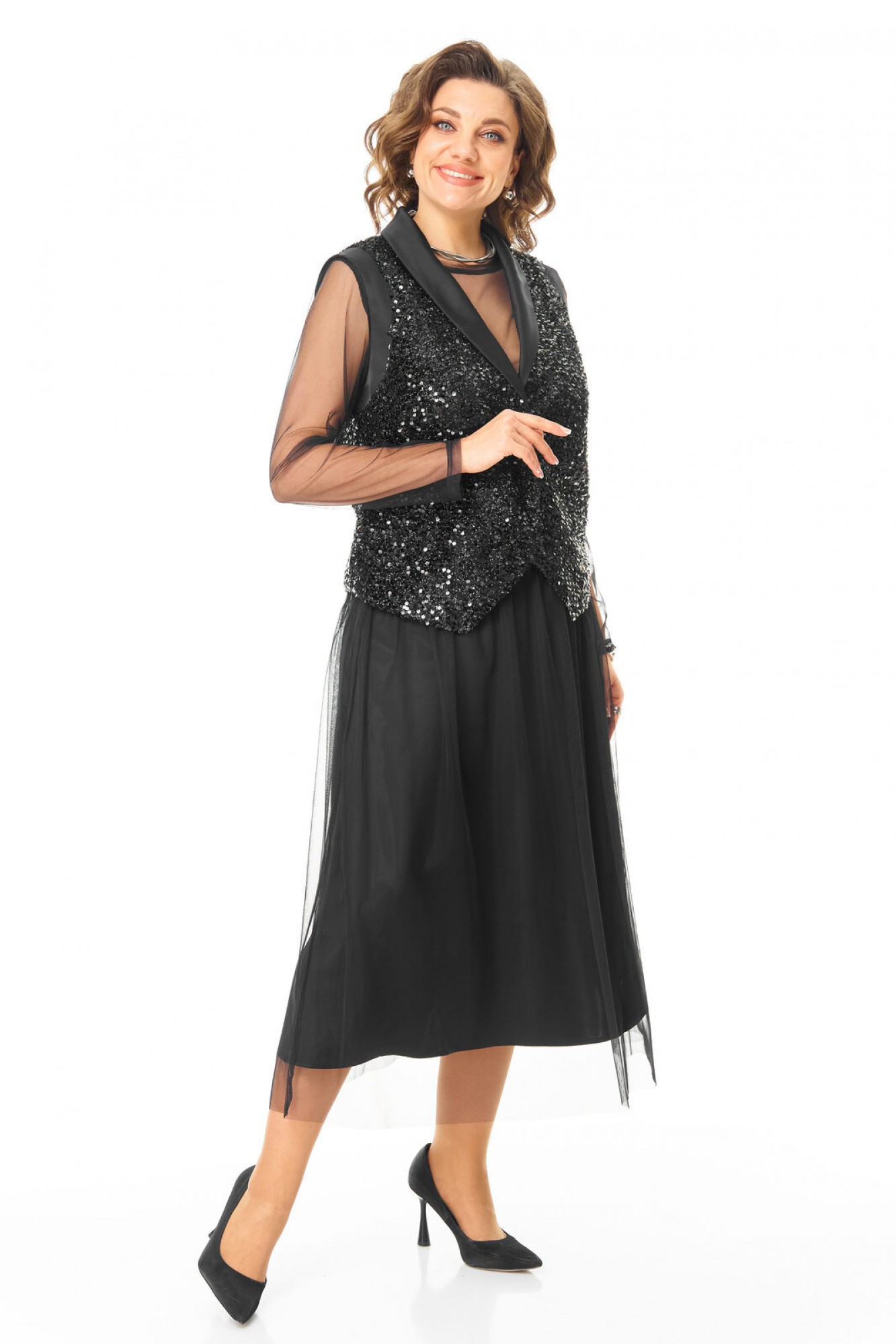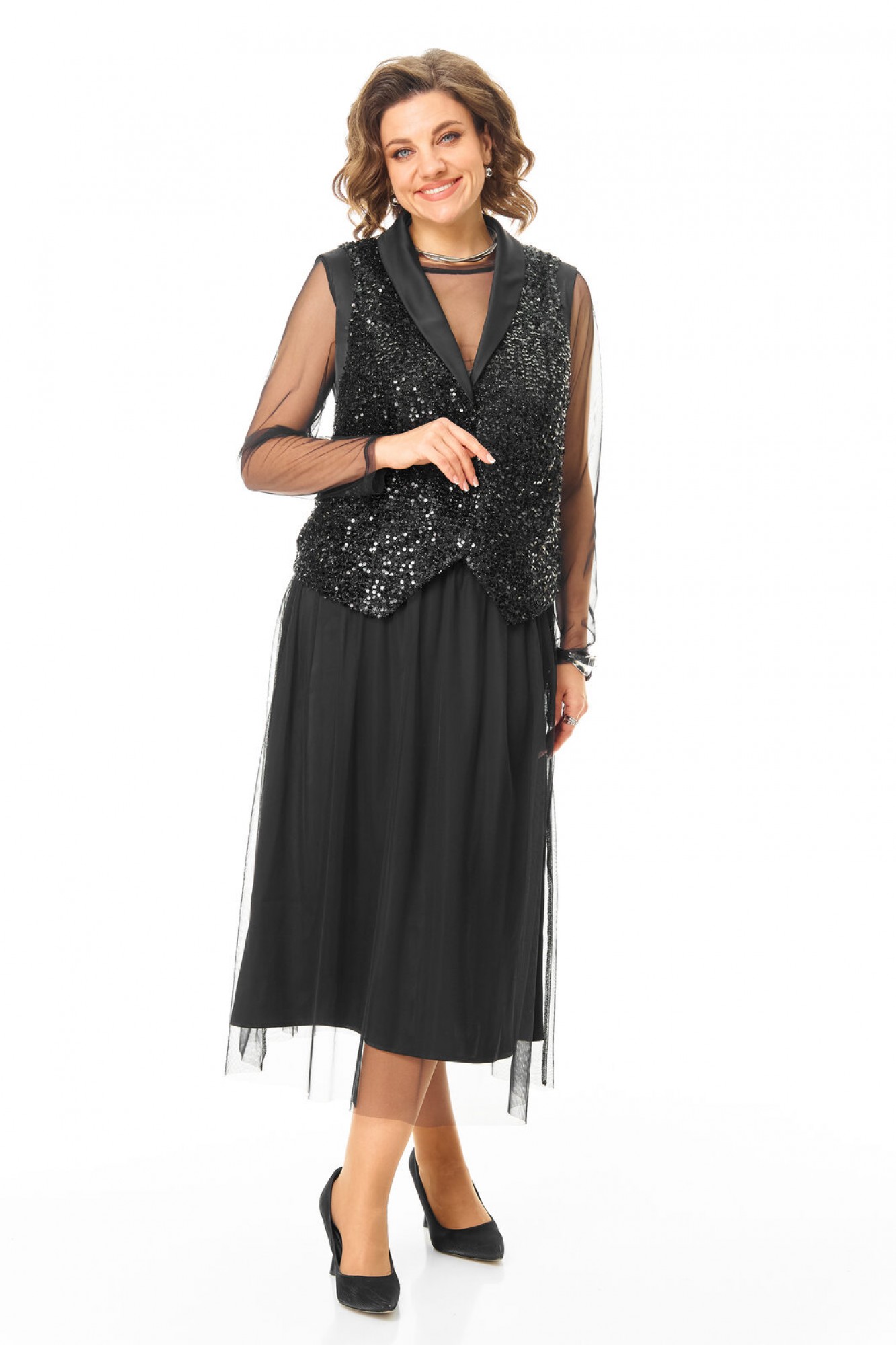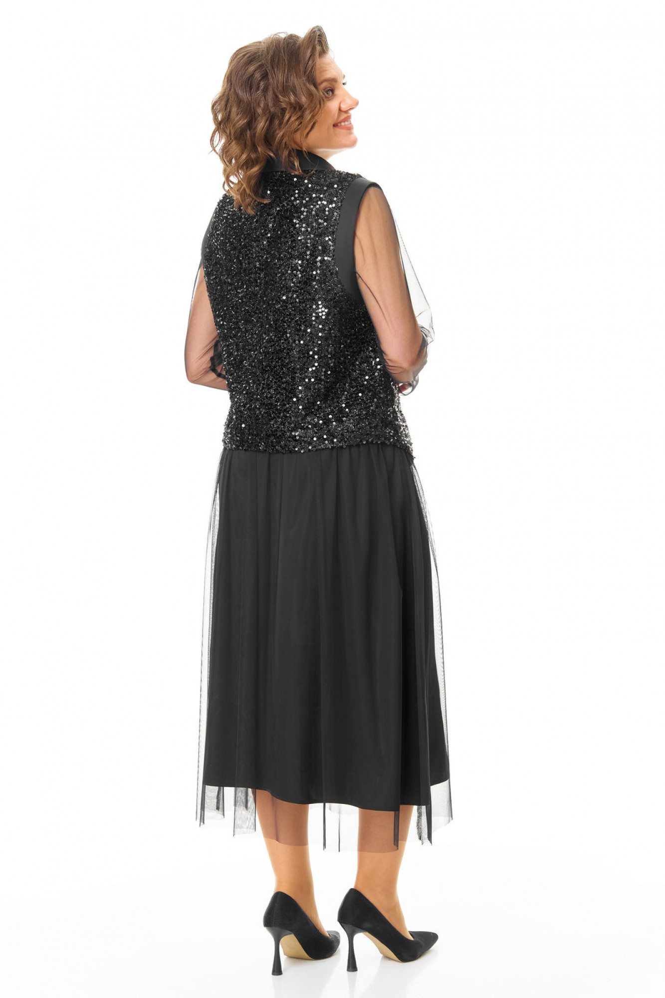 Комплект женский состоит из жилета, топа и юбки. Жилет полуприлегающего покроя на подкладке из шелковой атласной ткани. Перед и спинка выполнены из полотна с пайетками. По проймам выполнены бейки из атласной ткани. Низ жилета фигурной формы. Застёжка однобортная на потайные кнопки. Воротник отложной типа "шаль" из атласной ткани. Топ свободного покроя из полотна сетка. Горловина округлой формы, окантована. Рукав длинный. Юбка расширенная к низу длинной миди, двух слойная и двух уровневая. Нижний слой из шелковой атласной ткани, верхний из полотна сетка. Для удобства и свободы движения пояс на круговой резинке.