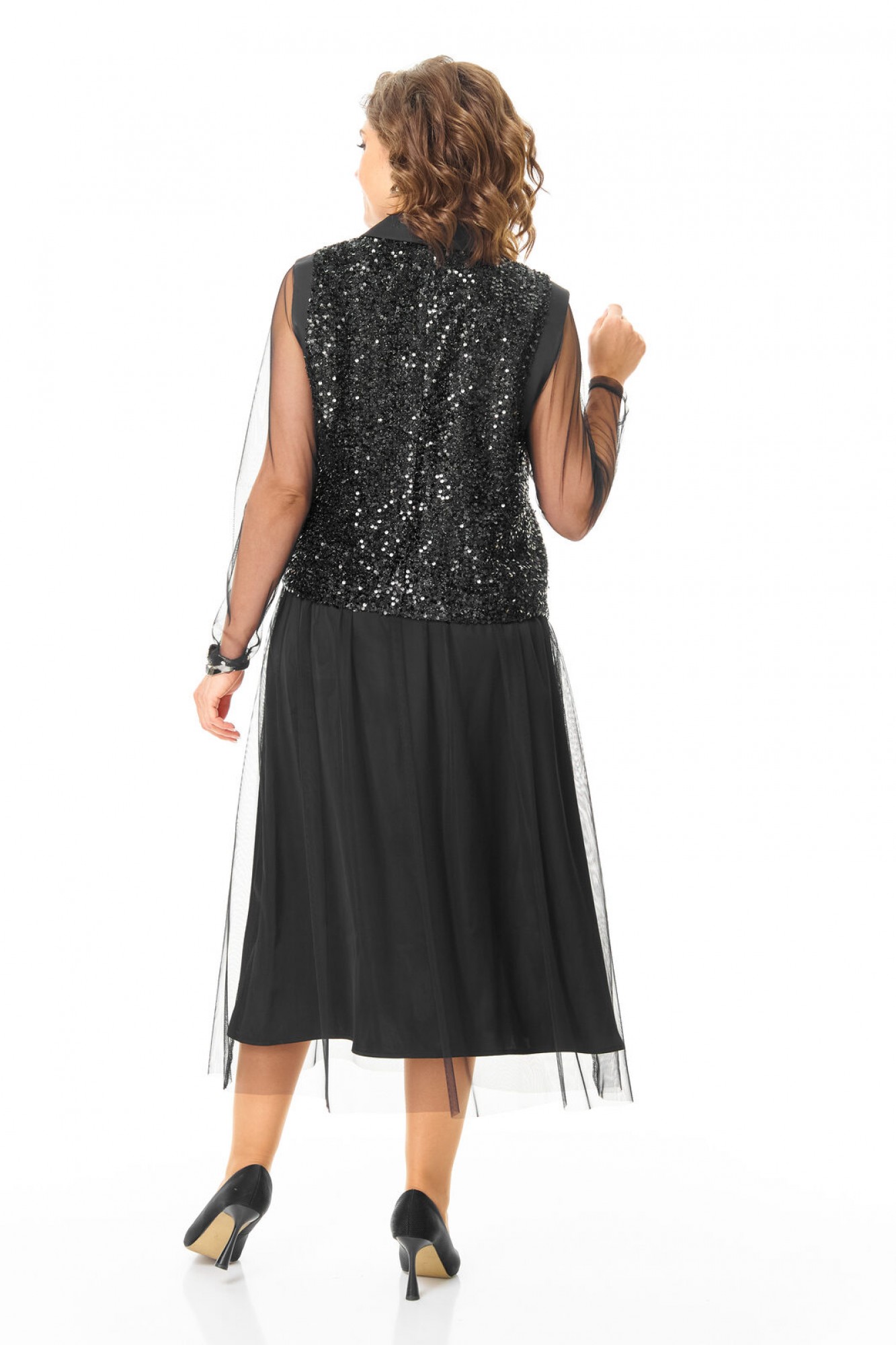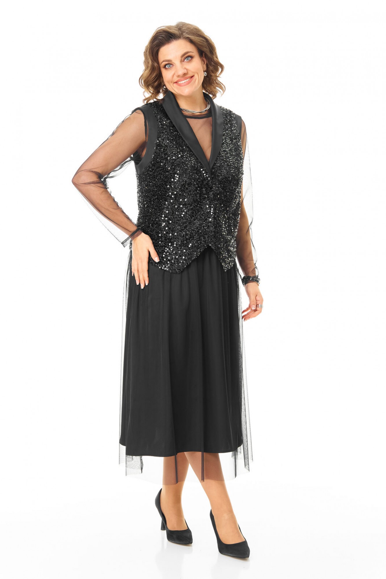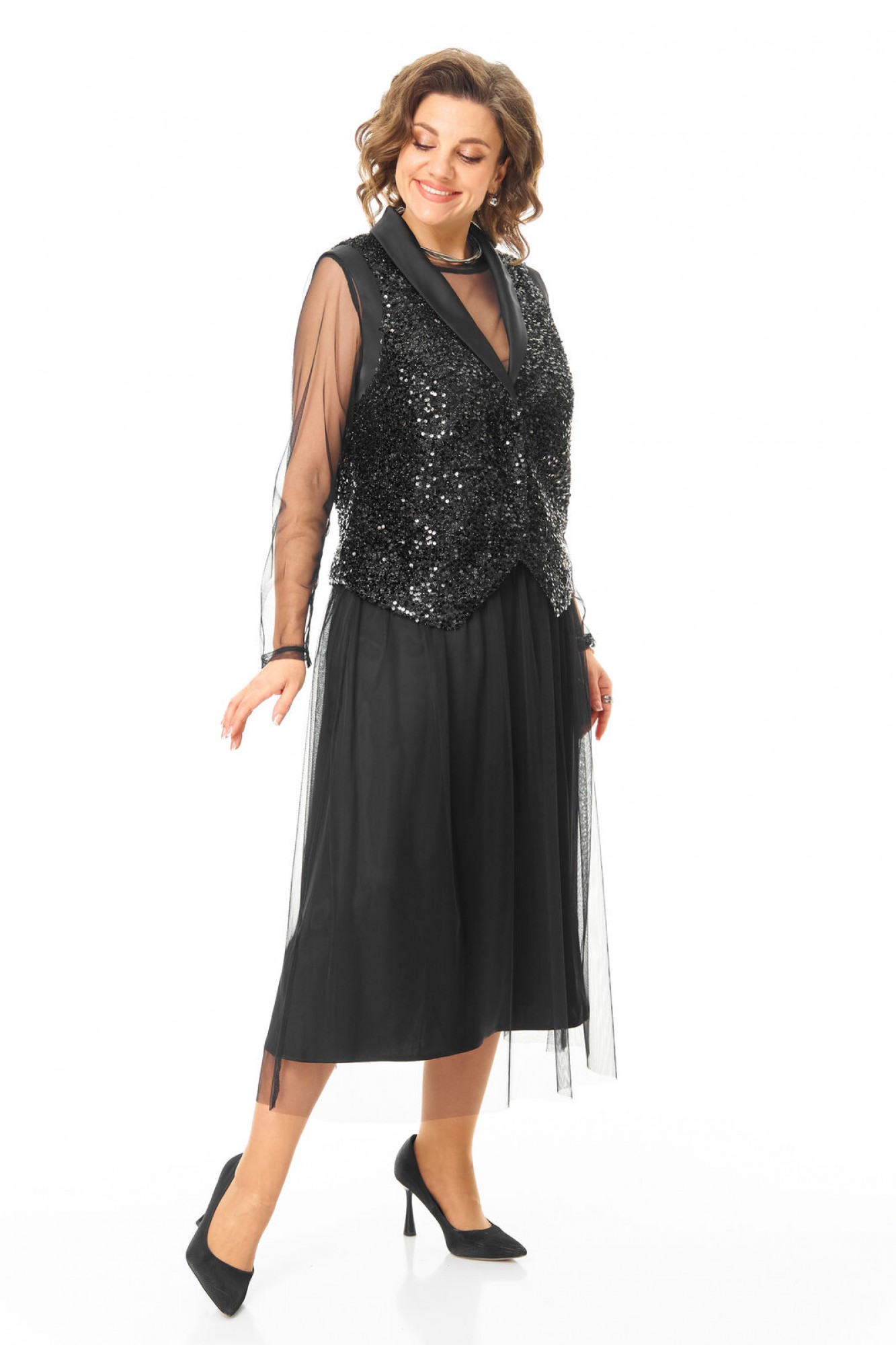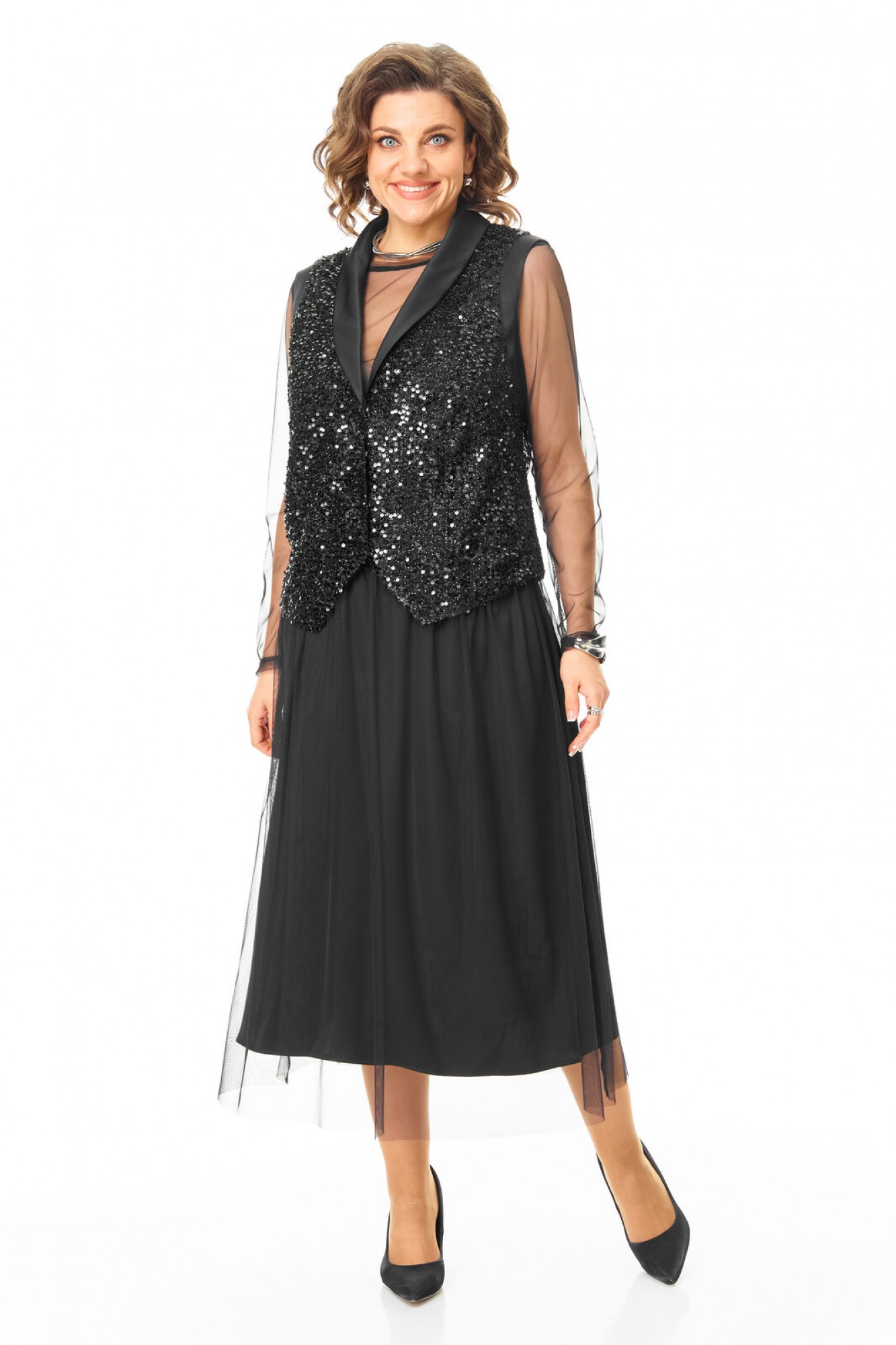 Комплект женский состоит из жилета, топа и юбки. Жилет полуприлегающего покроя на подкладке из шелковой атласной ткани. Перед и спинка выполнены из полотна с пайетками. По проймам выполнены бейки из атласной ткани. Низ жилета фигурной формы. Застёжка однобортная на потайные кнопки. Воротник отложной типа "шаль" из атласной ткани. Топ свободного покроя из полотна сетка. Горловина округлой формы, окантована. Рукав длинный. Юбка расширенная к низу длинной миди, двух слойная и двух уровневая. Нижний слой из шелковой атласной ткани, верхний из полотна сетка. Для удобства и свободы движения пояс на круговой резинке.