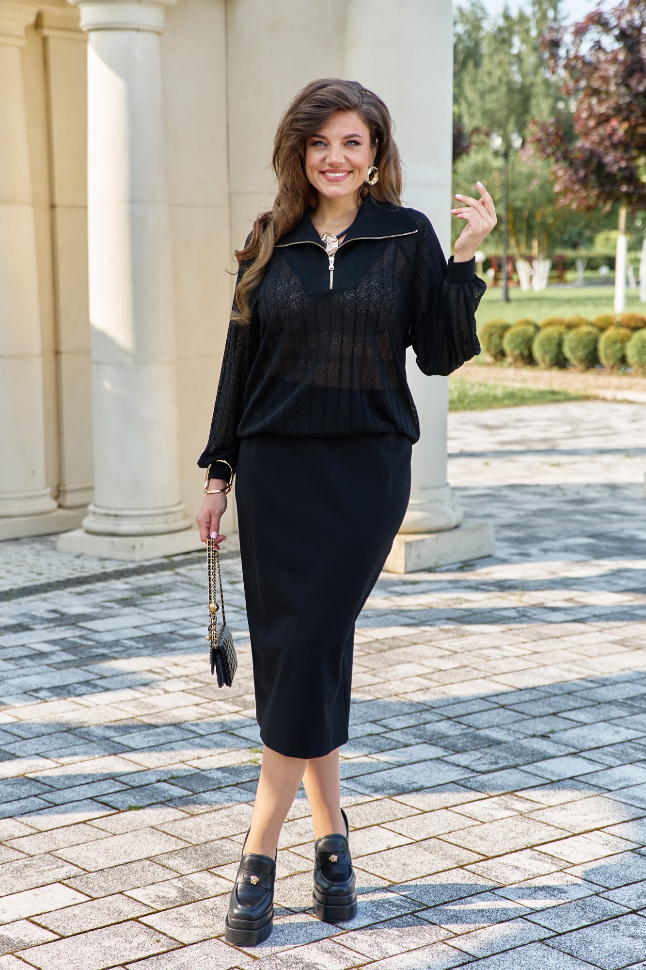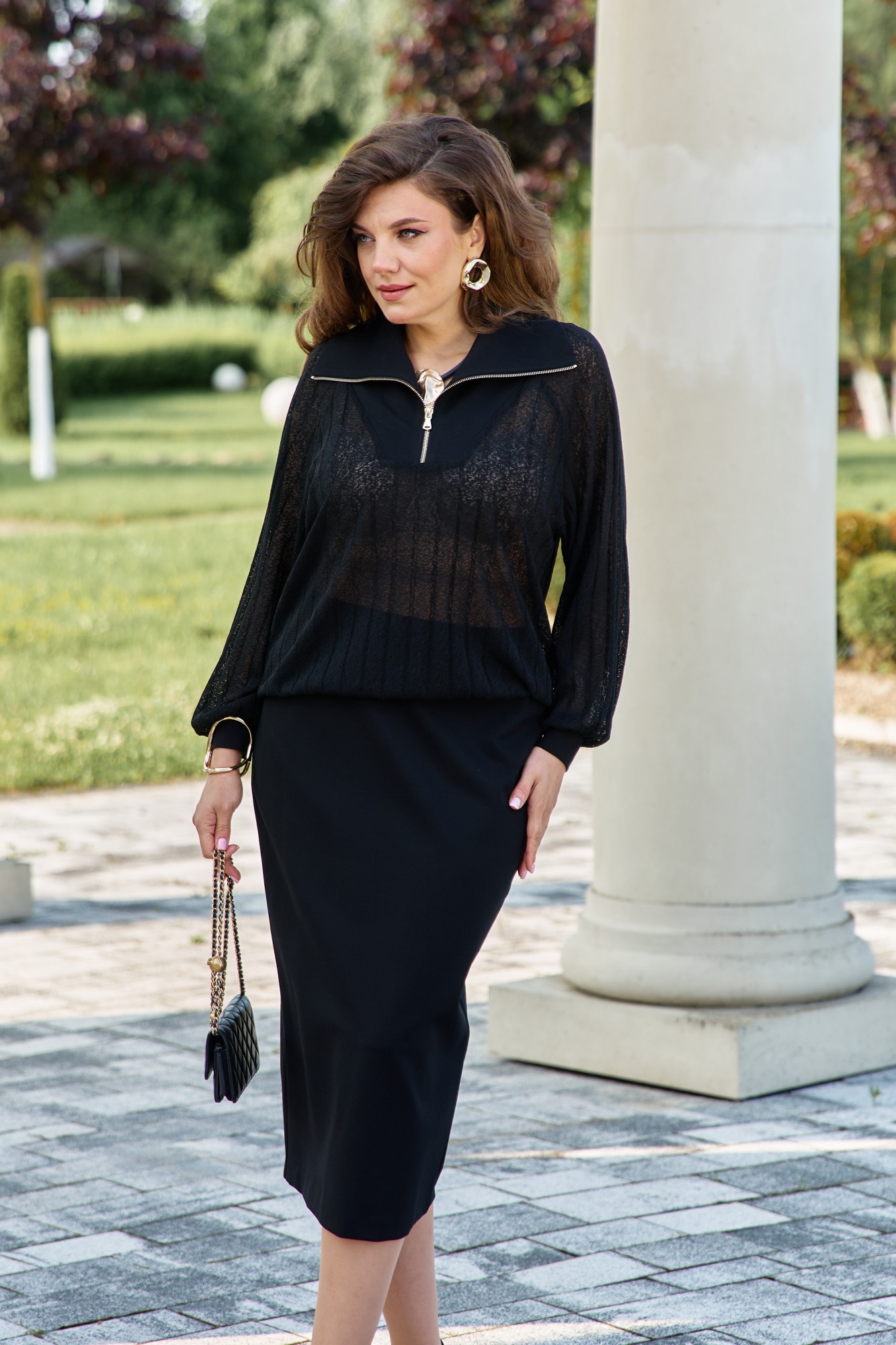 Комплект женский, состоящий из джемпера и юбки. Джемпер черного цвета, из полупрозрачного материала, его фактура — эффект гофре — это складки, они играют со светом, то поглощая его, то отпуская, создавая живое, дышащее полотно. Джемпер свободного силуэта, с планкой из отделочного материала переходящей в отложной воротник с застёжкой на декоративную тесьму-молнию. Рукав в джемпере- реглан со сборкой на притачную манжету из отделочной ткани. По спинке джемпера фигурная кокетка из отделочной ткани. Низ со сборкой на эластичную тесьму-резинку. Юбка прямого силуэта, удлинённая, зауженная книзу. Пояс в юбке притачной со вставкой в бочках декоративной тесьмы-резинки для удобного прилегания. В среднем шве заднего полотнища юбки застёжка на декоративную молнию, и разрез от низа.