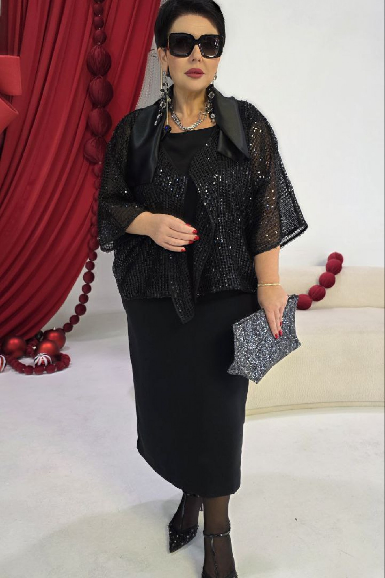 Комплект женский, состоящий из жакета и платья. Если Вы ищете идеальное сочетание стиля и комфорта, вот идеальный выбор. Мы специально подобрали качественную и тактильно приятную ткань, которая хорошо держит свою форму, создавая ощущение легкости и свободы движения. Стильный комплект - лучший выбор для тех, кто не боится самовыражаться и приковывать к себе взгляды окружающих. Жакет оверсайз жакет из чёрной сетки с мерцающей пайеткой и отложной атласный воротник, дополненный чёрным платьем-футляр. Жакет держится свободной линией на плечах, опускаясь до середины бедра. Сетка тонкая, полупрозрачная, но удерживает образ за счёт декоративной пайетки, которая мерцает точечными искрами. Пайетки распределены ровно и аккуратно, собирая свет в мелкие контуры по периметру каждого квадрата, создавая нежное, таинственное мерцание. Воротник ассиметричный, из гладкого атласа плавно ложится на плечи, добавляя комплекту строгий лоск и контраст матовой сетке. Его поверхность отражает свет иначе, чем сетка, подчеркивая линию шеи и проглядывая лоском на контрастной глубине ткани. Жакет с ассиметричной линией борта, отложным воротником из отделочной ткани. Линия плеча в жакете спущенная. Рукав втачной, длиной ¾. Спинка без особенностей. Жакет на подкладке. Платье платье-футляр, сознательно строгого кроя оно безупречно сидит по фигуре, подчеркивая талию и плавность бедра, но не перегружает образ, оставляя место для движения и дыхания ткани. Линия горловины в платье по форме «лодочка», с отрезными кокетками и талиевыми вытачками по переду. Линия проймы в платье фигурной формы, что придаёт изделию индивидуальности. По спинке платья отрезная кокетка и разрез в среднем шве от низа. Платье на подкладке. Образ держится на противоречии между полупрозрачной сеткой жакета и плотной безупречной вертикалью платья-футляр. Сочетание материалов создаёт эффект минималистичной, но насыщенной чувственности: сетка и пайетки добавляют лёгкость и игру света, тогда как платье добавляет силу и уверенность.