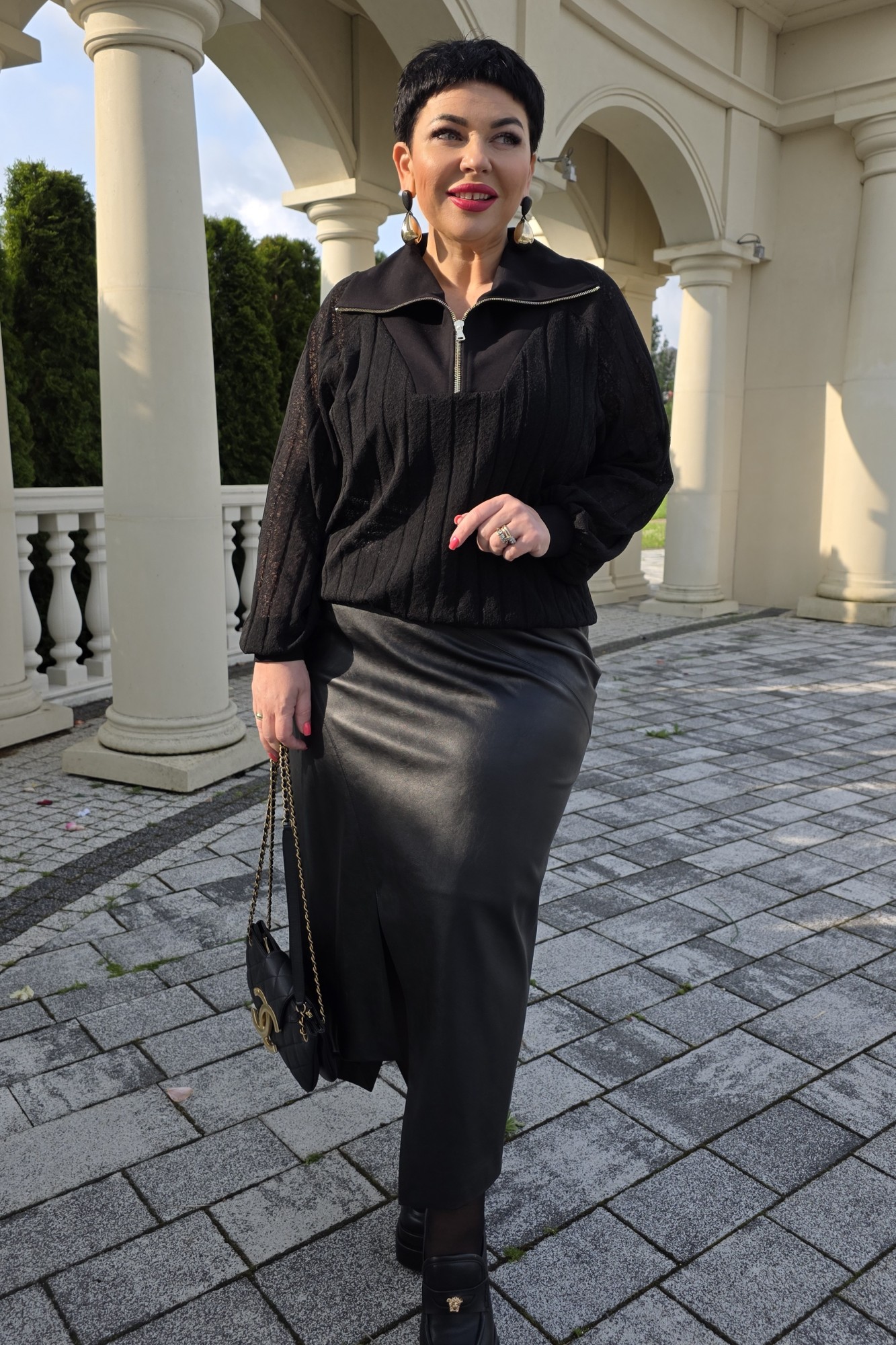 Комплект женский, состоящий из джемпера и юбки. Джемпер черного цвета, из полупрозрачного материала, его фактура — эффект гофре — это складки, они играют со светом, то поглощая его, то отпуская, создавая живое, дышащее полотно. Джемпер свободного силуэта, с планкой из отделочного материала переходящей в отложной воротник с застёжкой на декоративную тесьму-молнию. Рукав в джемпере- реглан со сборкой на притачную манжету из отделочной ткани. По спинке джемпера фигурная кокетка из отделочной ткани. Низ со сборкой на эластичную тесьму-резинку. Юбка прямого силуэта, удлинённая, зауженная книзу с отделочными строчками по рельефам и фигурной линией низа. Рельефы на переднем и заднем полотнище переходят в ассиметричные разрезы. Притачной пояс с эластичной тесьмой сзади обеспечивает максимально удобную посадку на любой тип фигуры. Застежка на молнию в боковом шве и пуговицу в поясе.