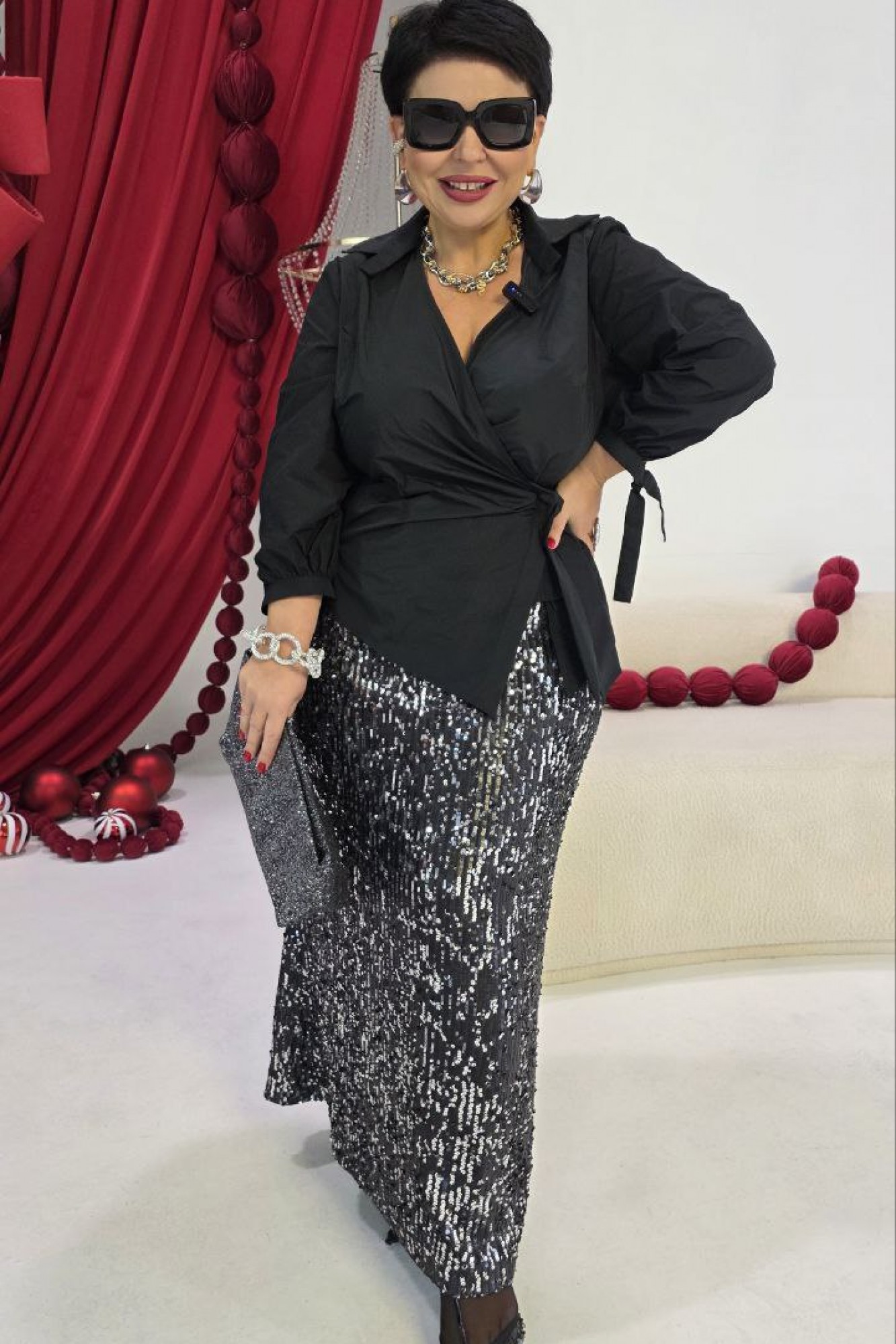 Потрясающий юбочный комплект, состоящий из блузки и юбки, который подарит вам ощущение праздника и непринуждённости. Ассиметричный крой блузы отлично гармонирует с ярким в пайетки низом, создавая тем самым идеальный комплект. Блуза прямого силуэта с запахом на поясе завязке с декоративным элементом в виде вышивки на кокетке спинки. Горловина V-образная, воротник рубашечный с дизайнерским решением. С фигурными рельефами по переду и ассиметричным низом. Спинка блузки с рельефом и с запахом внизу. Рукав втачной одношовный по низу со сборкой и манжетом с завязкой. Юбка прямого силуэта. Пояс цельновыкроенный с эластичной тесьмой, что обеспечивает максимально комфортную посадку на любой тип фигуры. Юбка на трикотажной подкладке, по низу со внутренней стороны обтачка из подкладочной ткани для максимального удобства.