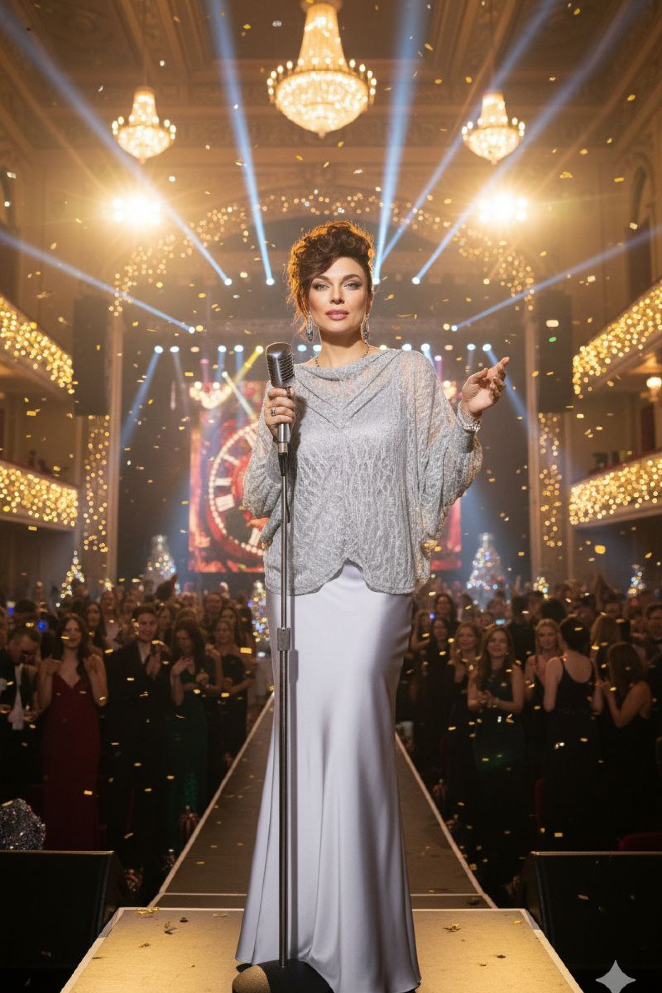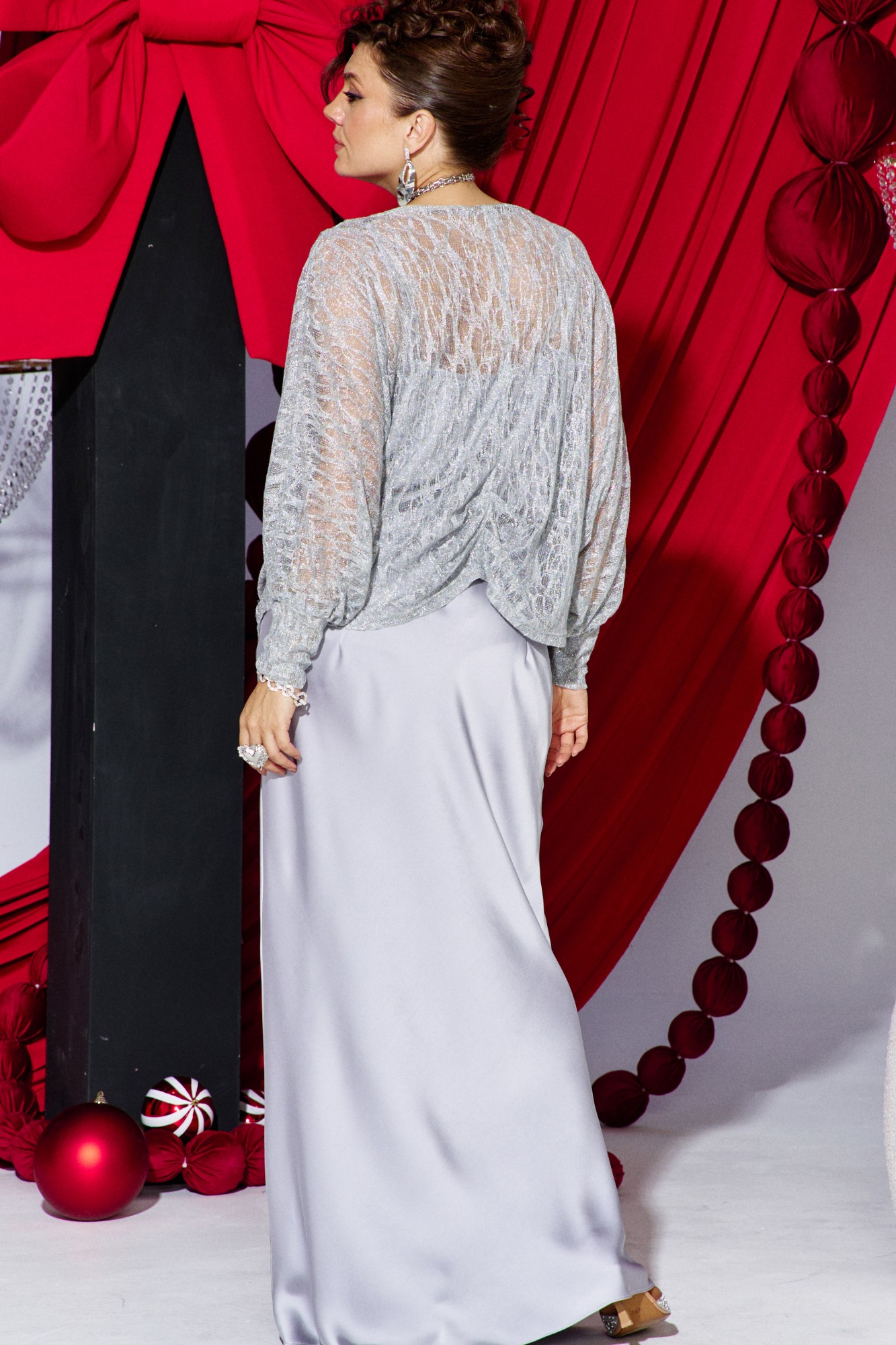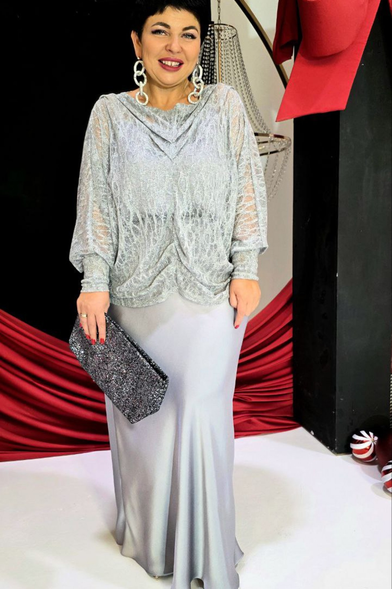 Комплект женский юбочный, состоящий из блузона, блузы и юбки. Комбинация текстур создаёт баланс между комфортом и эффектной внешностью. Тонкий трикотаж блузона держит верх мягко и деликатно, не перегружая образ, в то время как атласная юбка привносит лаконичную драму и движение. Их союз напоминает современную картину: спокойная энергия блузона встречается с холодной иронией юбки, образуя наряд, который подходит как для повседневной городской среды, так и для торжественных павильонов, когда нужен стиль без лишних слов. Блузон из тончайшего трикотажа держится на теле как вторая кожа: прозрачность ткани едва скрывает очертания силуэта, а тонкий плетёный рисунок ловко ловит свет, создавая игру полупрозрачных переходов. Его цвет— словно утренний туман, в котором каждая деталь дышит воздухом утончённости. Манжеты и блузона остаются эластичными и облегающими, подчёркивая плавные линии плеч и груди, без лишних объёмов, будто ткань шепчет о хрупкости и комфорте. По переду блузона средний шов с заложенными декоративными складками от горловины и от низа, направленные на встречу друг-другу. Рукав в блузоне цельнокроеный с притачной высокой манжетой. Блуза свободного силуэта, с нагрудными выточками по переду, и разрезами в боковых швах; на регулируемых бретелях. По спинки блузы вставка эластичной тесьмы-резинки, обеспечивающей максимально удобное прилегание. Юбка атласная в стальном металлическом оттенке добавляет образу холодной свежести и энергетического акцента. Юбка длины «миди» с притачным поясом, вставкой эластичной тесьмы-резинке в задней части пояса и застёжкой на потайную тесьму-молнию в боковом шве и пуговицу в поясе.