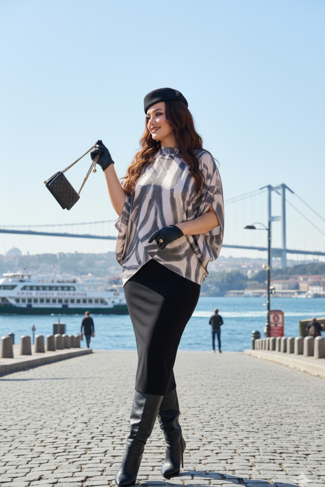 Юбочный комплект женский двух – предметный, состоящий из блузки и юбки. Безумно элегантный и стильный комплект, который заставит обратить на себя внимание. Силуэт визуально вытягивает фигуру, позволяя скрыть недостатки и подчеркнуть особенности фигуры. Блузка «oversize» силуэта с расширенной горловиной округлой формы; горловина оформлена стойкой, линия плеча спущенная. По переду и спинке блузки идут декоративные подрезы. Рукав в блузке в стиле «кимоно» с конструктивным разрезом. Юбка прямого силуэта удлинённая, с притачным поясом, резинкой в бочках и застёжкой на молнию и пуговицу в поясе. В среднем шве юбки отлетная шлица. Юбка на подкладке.