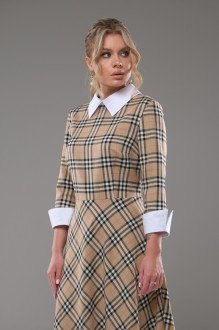 Платье женское полуприлегающего силуэта. Изготовлено из текстильного полотна костюмно-плательной группы. Платье отрезное по линии талии. В боковом шве обработана молния. Перед с нагрудными вытачками идущими с боковых швов и талиевыми, расположениями в отрезной линии талии. Спинка со средним швом, в которой расположена молния и двумя талиевыми выточками. Юбка ""клеш"" ложится мягкими фалдами. Длина платья ниже щиколотки. Рукава одношовные 3/4, заканчивающиеся отложной манжетой белого цвета. Воротник на стойке, стояче отложной белый.
