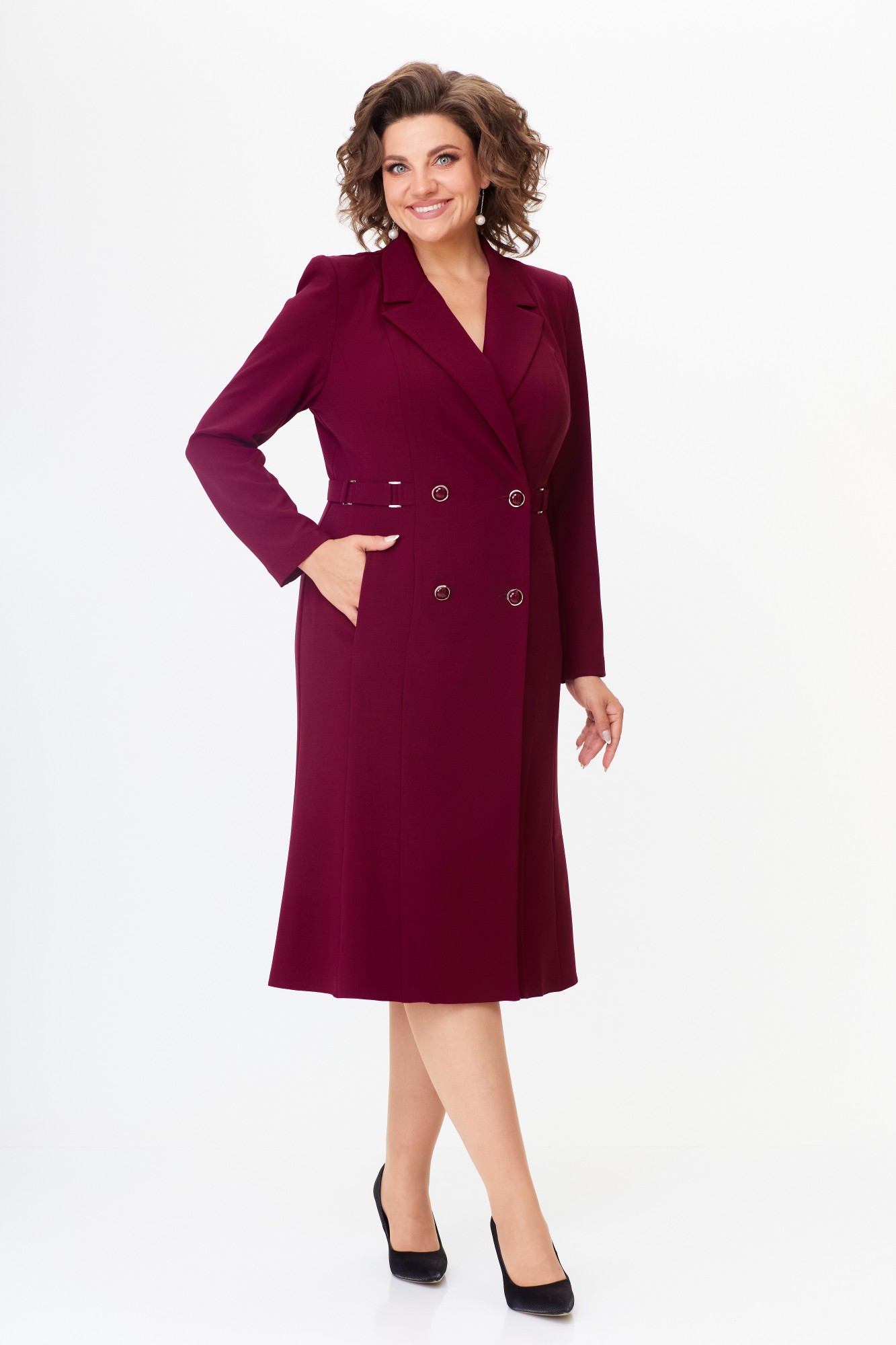 Платье полуприлегающего силуэта, выполнено из однотонной ткани. Платье длиной за колено, с небольшим расклешением по низу. Полочка платья с двубортной застежкой на пуговицы. Полочка с вертикальными рельефами. В шве притачивания бочка к средней части полочки обработан карман. Горловина V-образной формы, с отложными лацканами и воротником пиджачного типа. В области талии выполнен декоративный элемент из хлястиков и металлических рамок. Спинка со средним швом и вертикальными рельефами. Рукав длинный, двухшовный, втачной.