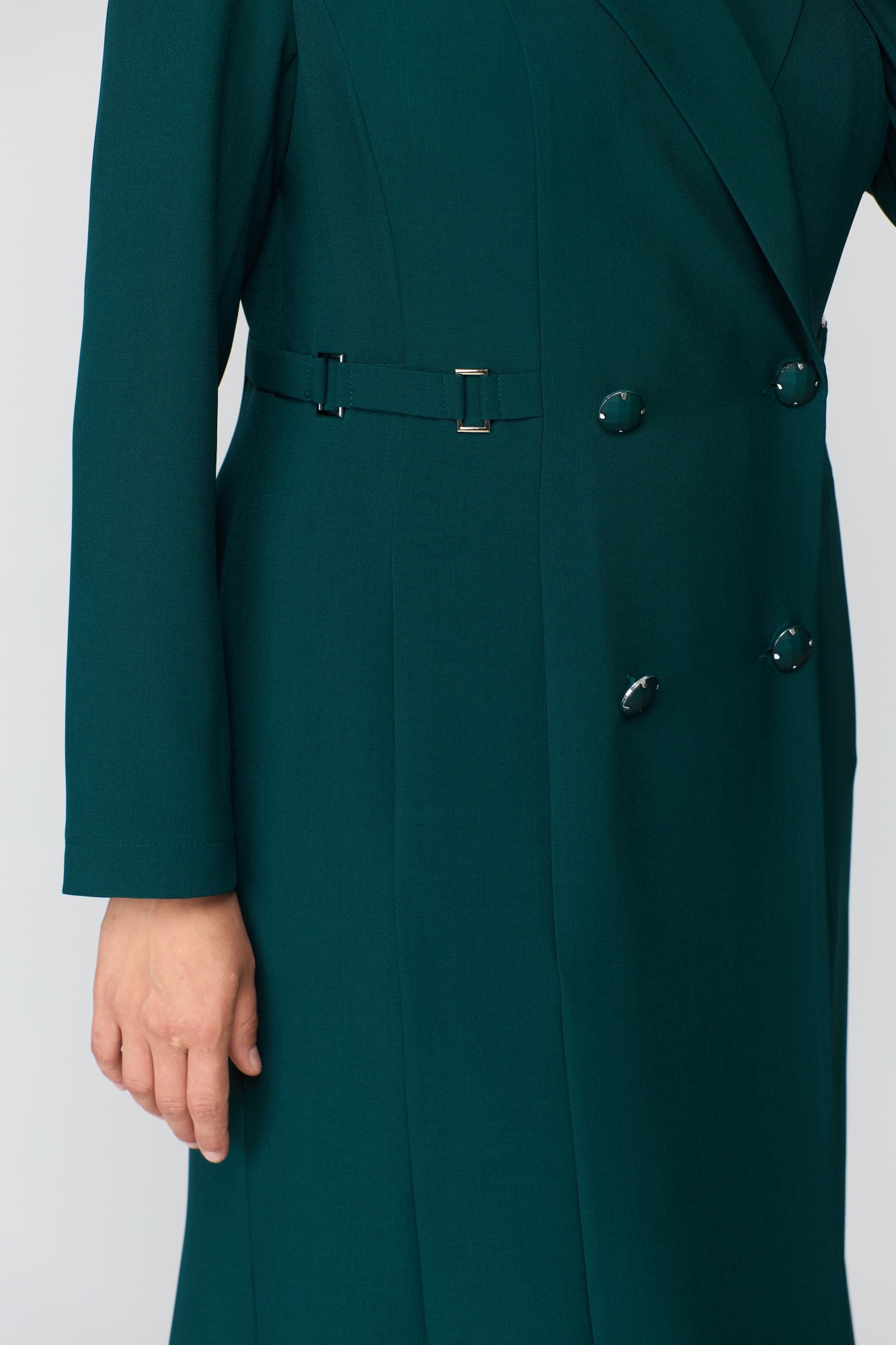 Платье полуприлегающего силуэта, выполнено из однотонной ткани. Платье длиной за колено, с небольшим расклешением по низу. Полочка платья с двубортной застежкой на пуговицы. Полочка с вертикальными рельефами. В шве притачивания бочка к средней части полочки обработан карман. Горловина V-образной формы, с отложными лацканами и воротником пиджачного типа. В области талии выполнен декоративный элемент из хлястиков и металлических рамок.