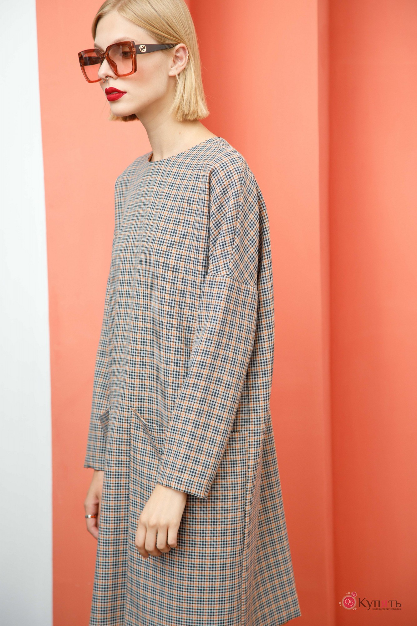 Платье свободного кроя оверсайз выполнено из костюмной ткани в мелкую клетку, на подкладке, рукав спущенный длинный. По переду округлый вырез горловины, нагрудные вытачки, накладные отлетные карманы. По спинке средний шов, переходящий в застёжку на металлической молнию.