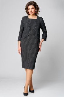 Платье женское, полуприлегающего силуэта. По переду имитация жилета с нефункциональными листочками и пуговицами в виде декора. Спинка со средним швом, потайной молнией в верхней части спинки и разрезами по низу. Талиевые вытачки. Рукав втачной, двухшовный, в локтевом шве имитация шлицы с двумя пуговицами.