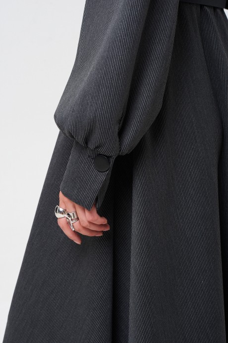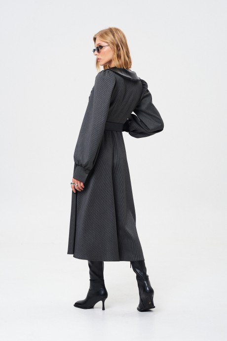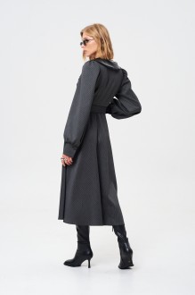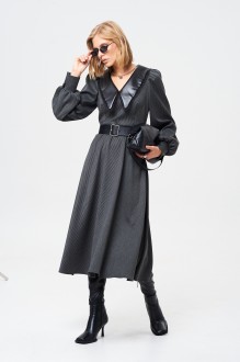 Платье классического силуэта из трикотажной костюмной ткани в мелкую полоску. Съемный воротник из экокожи декорирован тесьмой. Ремень в комплекте.