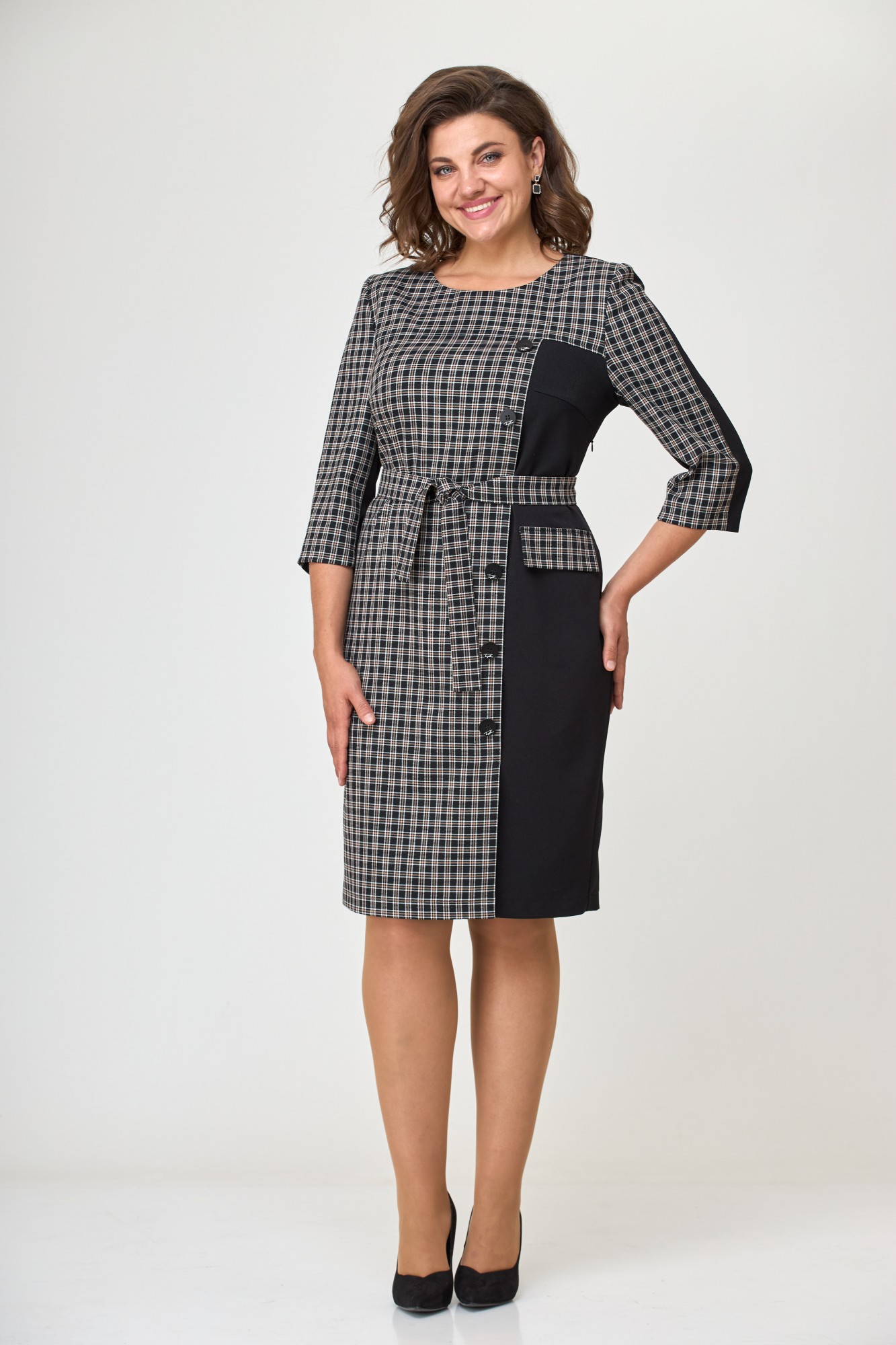 латье женское полуприлегающего силуэта, втачного покроя. Рукав трехчетвертной, Спинка цельная с вертикальными талевыми вытачками. Перед состоит из кокетки (клеточка), правой части, которая имитирует застежку идущую от кокетки, переходящую в шлицу. Левая часть переда выполнена из однотонна, в области бедер расположен клапан, направленный горизонтально (выполнен из клетчатой ткани). Декоративная застежка оформлена контрастными пуговицами в цвет однотона. Горловина в платье округлой формы. Дополнением является пояс из клетчатой ткани.
