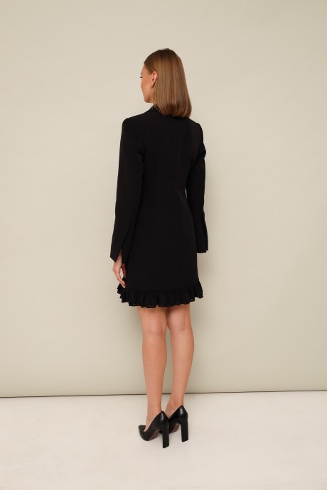Стильное платье полуприлегающего силуэта, выполнено из костюмно-плательной ткани. Застёжка центральная на петли и пуговицы, внутри платье фиксируется на потайную пуговицу. Воротник пиджачного типа с отложными лацканами. Перед платья с рельефами и наклонными карманами с клапанами в рамку. Рукава втачные с высокими шлицами по низу. Низ платья с оборкой в 2 ряда из отделочной ткани. Спинка с рельефами и средним швом. Изделие на подкладке.
