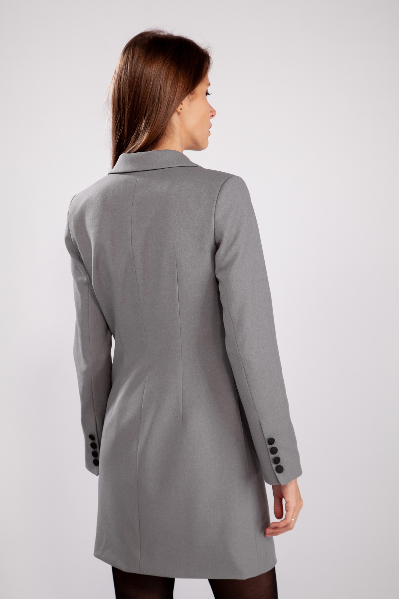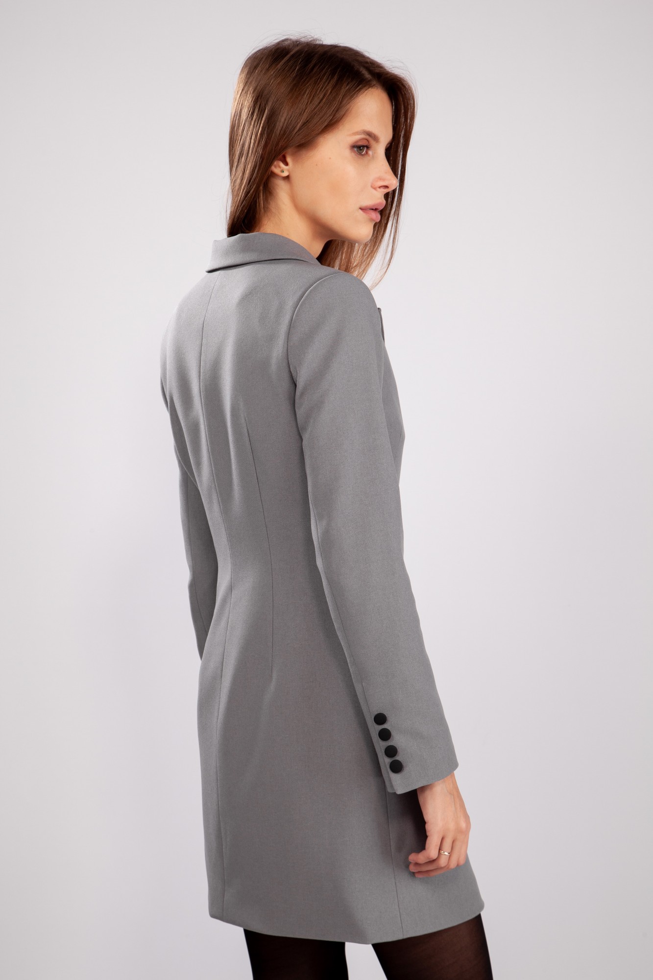 Платье двубортное на восемь петель-пуговиц, воротник стоячий, отложной с лацканами.