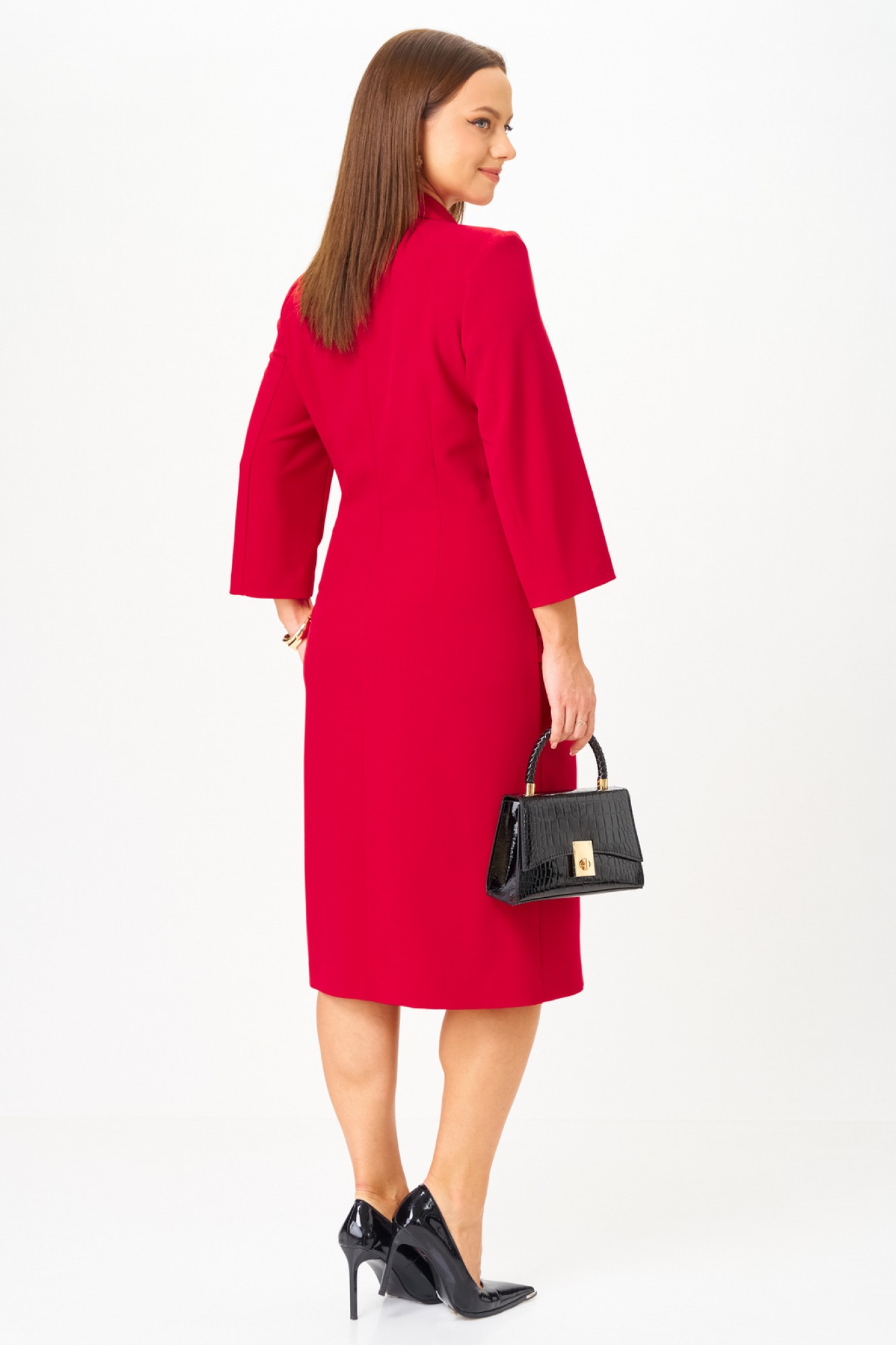 Платье прилегающего силуэта, длиной миди, выполненное из плательной поливискозы. Платье жакетного типа с ассиметричным передом. Одна из сторон переда имитирует жакет и юбку, другая-платье. Перед с талиевыми вытачками с подрезом. В области груди настрочена декоративная листочка, в области бедер - карманы-обманки с листочками и клапаном. По переду обработан разрез. В области талии расположена застёжка на 2 петли и крупные декоративные пуговицы. Спинка со средним швом, в который вставлена потайная молния. Рукав 2-х шовный втачной, длиной 3/4.