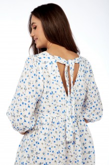 Отрезное платье, юбка на сборке. Квадратный вырез горловины, выгодно подчеркивающий лицо и шею. На спинке глубокий V-образный вырез, по плечам функциональная завязка. Втачной рукав, по окату со сборкой, низ на резинке, длина 3/4.
