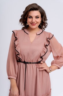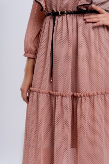 Платье женское полуприлегающего силуэта, расклешенного к низу от талии, на подкладке. Платье отрезное по линии талии, собранное на резинку. Верхняя часть переда со средним швом и с рельефами, выходящими из плечевого шва и до талии. В швах рельефов расположены рюши, собранные на сборку и задекорированы черной, отделочной тесьмой. Спинка с притачной кокеткой, в шве которой расположена встречная складка в нижней части. Вырез горловины V-образный. Нижняя часть платья состоит из двух частей, нижняя часть которой собрана на сборку. Воротник – плосколежащая стойка, шов притачивания которой, задекорирован отделочной, черной тесьмой. Рукав втачной, внизу на резинке. В качестве декора используется съемный, тонкий, черный ремень. Платье очень женственное, удобное, не сковывает движения, может подойти на все случаи в жизни, как для вечерних прогулок по городу, так и для торжеств.