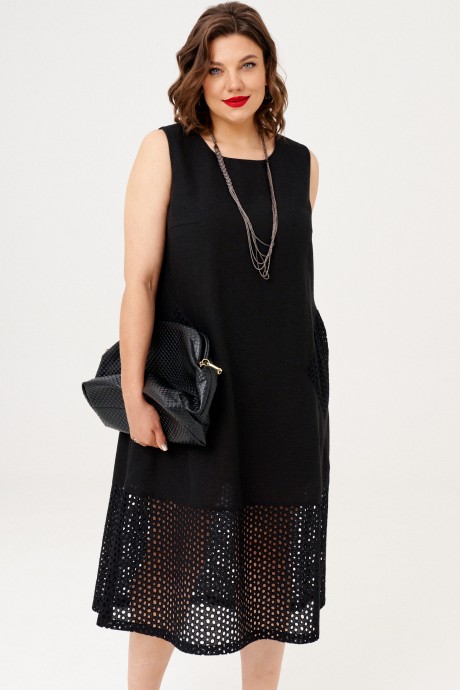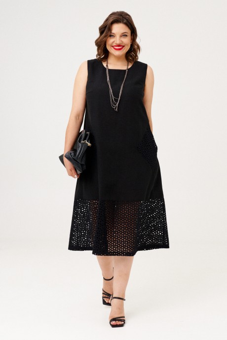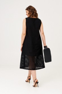 Простое, но стильное платье свободного силуэта, выполнено из 2 - х видов ткани, лен и х/б шитье. По спинке застежка на подвесную петлю и пуговицу. По переду фигурные подрезы и накладные карманы из шитья. По низу платья подрез из шитья, что придает легкость и загадочность изделия.