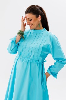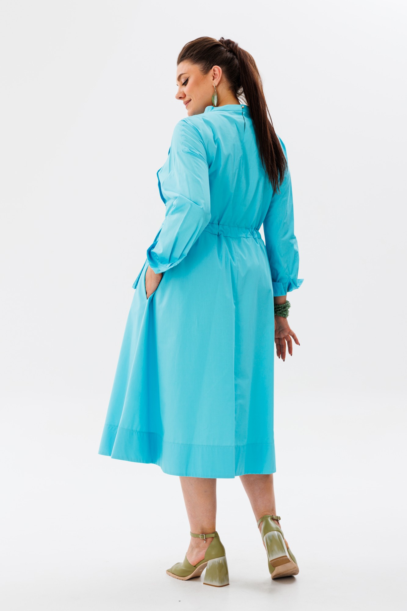 Втачной пояс регулируется по ширине съёмными завязками, что позволяет подчеркнуть талию и создать идеальную посадку. Практичные боковые карманы обеспечивают дополнительное удобство. Воротник-стойка, застёгивающийся на спинке на навесную петлю и пуговицу, придаёт платью стильный и аккуратный вид.
