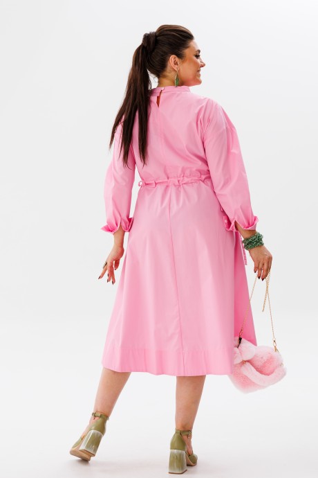 Втачной пояс регулируется по ширине съёмными завязками, что позволяет подчеркнуть талию и создать идеальную посадку. Практичные боковые карманы обеспечивают дополнительное удобство. Воротник-стойка, застёгивающийся на спинке на навесную петлю и пуговицу, придаёт платью стильный и аккуратный вид.