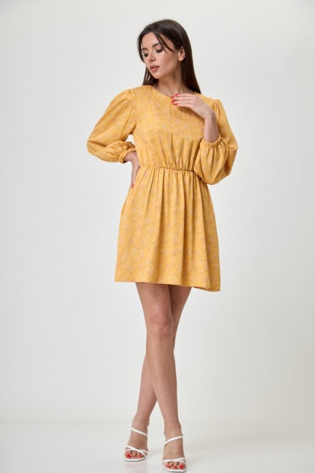 Свободный крой, округлая горловина и длина до колена создают образ воздушности и легкости. Рукав 3/4 с сборкой по окату и низом на резинке добавляет игривости и удобства. Линия талии подчеркнута эластичной резинкой, что придает фигуре изящество.