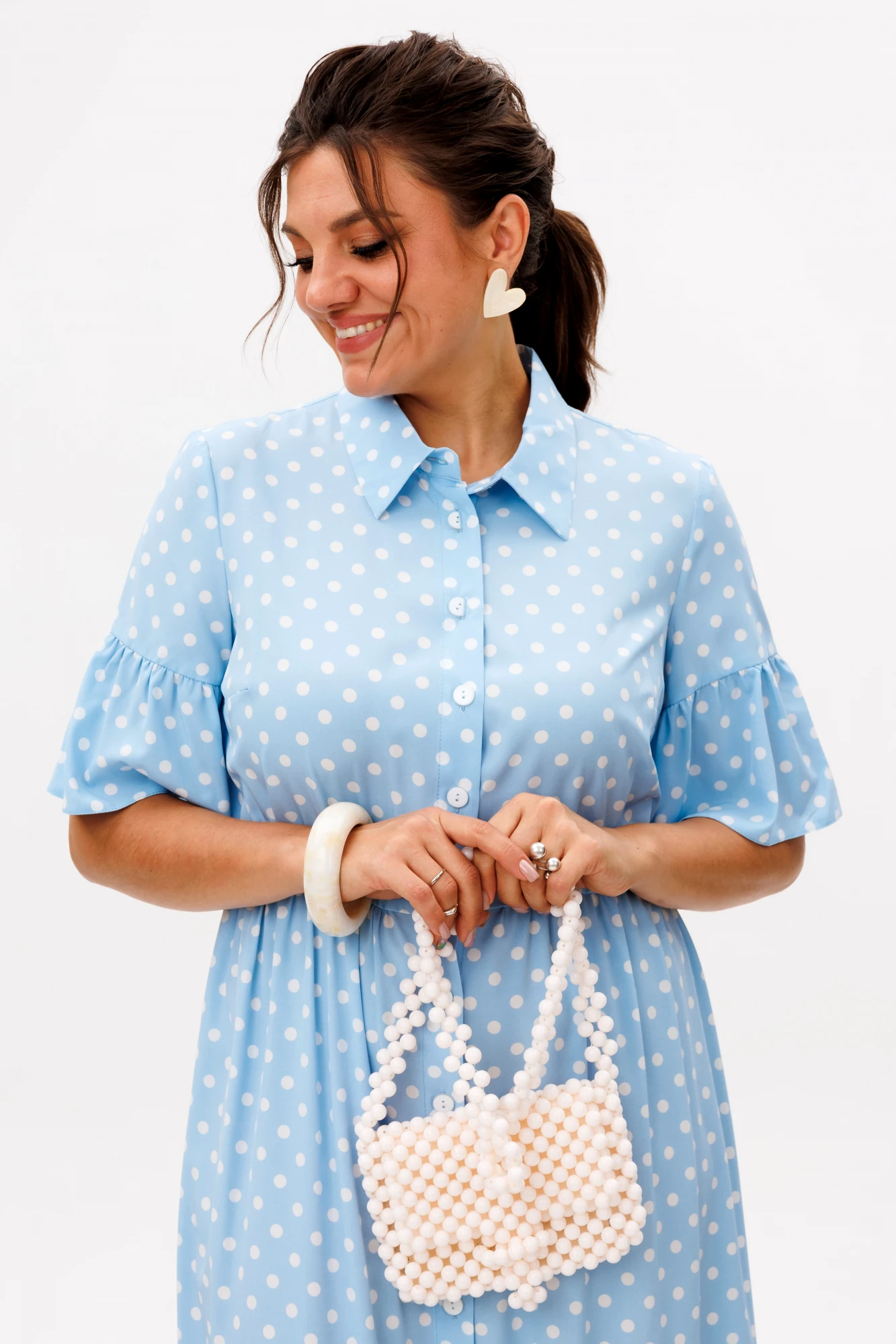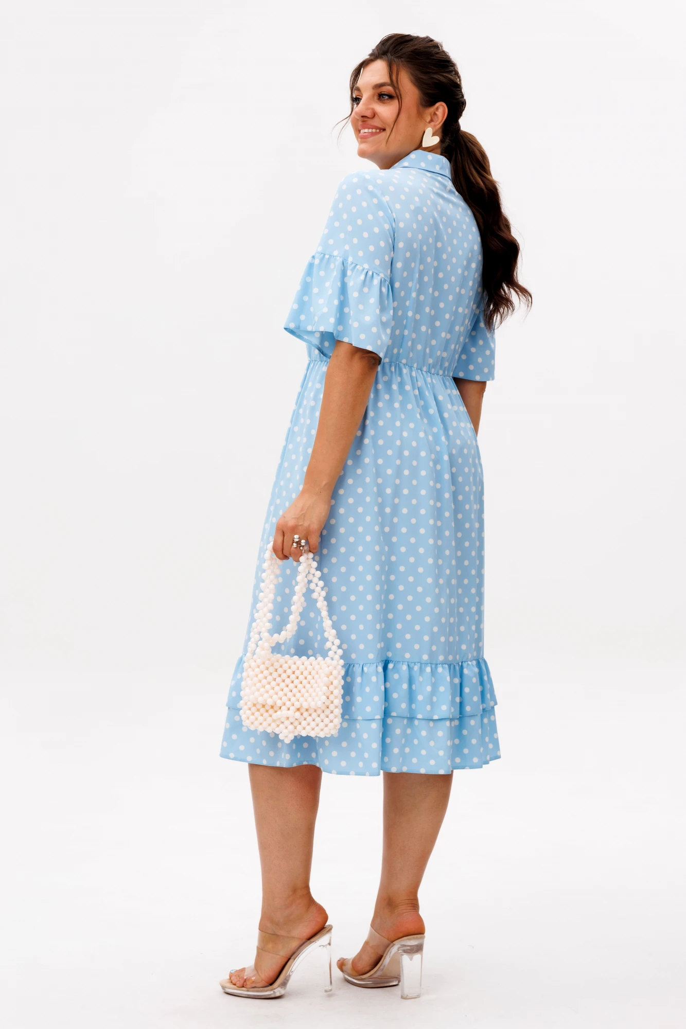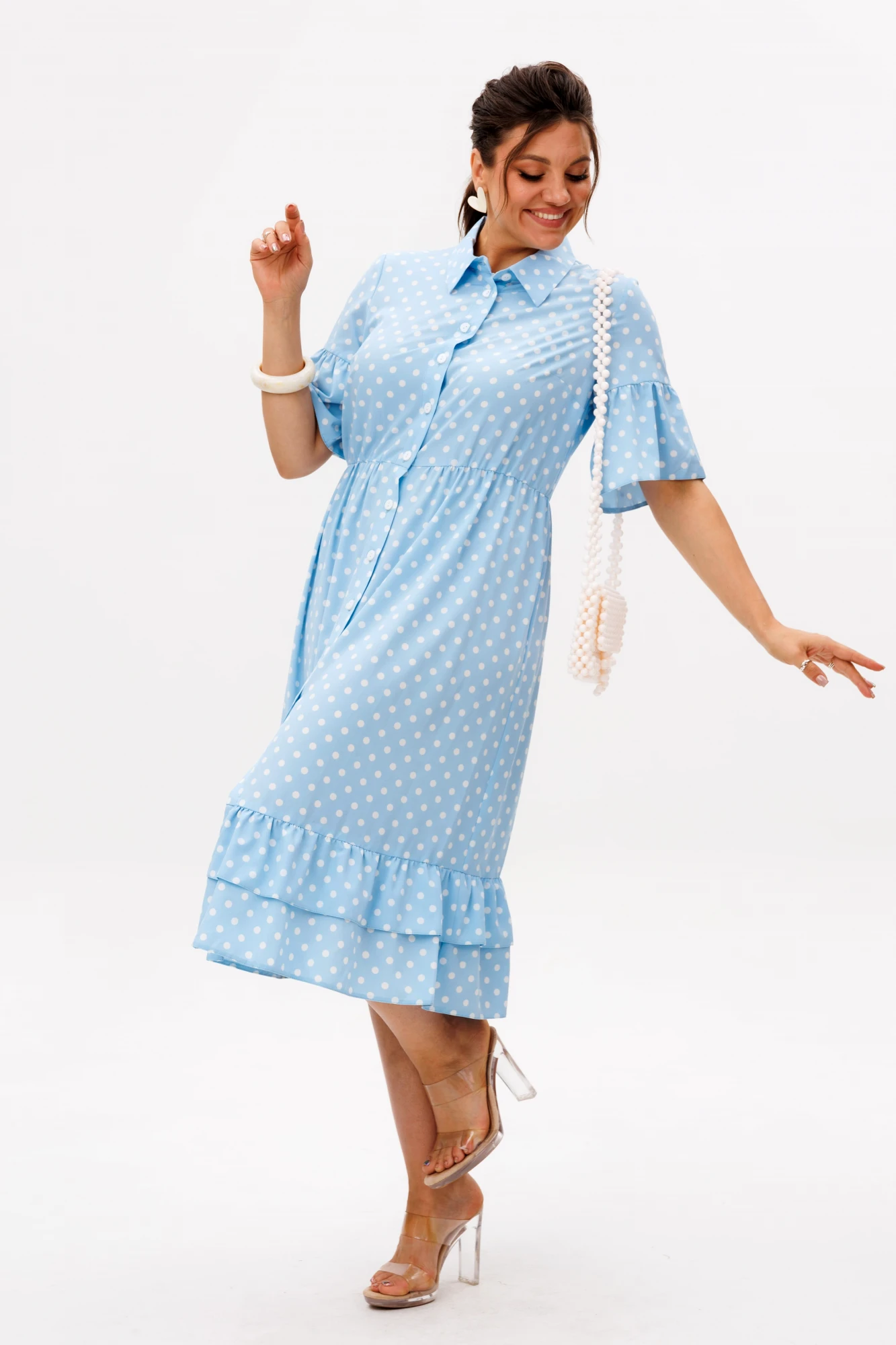 Воздушное и женственное, это платье станет жемчужиной вашего гардероба. Стильный горошек - вечный тренд, который никогда не выходит из моды, придаёт образу лёгкую игривость и очарование.