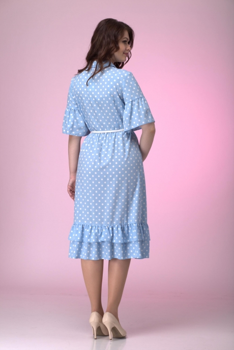 Полуприлегающий силуэт, отрезное по линии талии, нагрудные вытачки втачные рукава с воланом. Отложной воротник на стойке. Функциональная застежка по планке на пуговицы по всей длине. Воланы по низу платья.