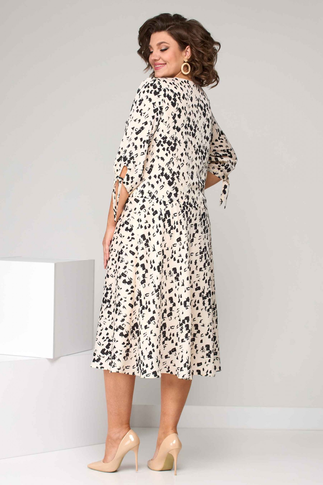 Платье женское, нарядно-повседневное, из тонкой плательной ткани. Горловина V-образная, рукав расширенный, на манжету с завязкой. Лиф платья отложной, имитирует блузку. Юбка платья покроя «клёш». Платье без застёжки. Платье на трикотажной подкладке.