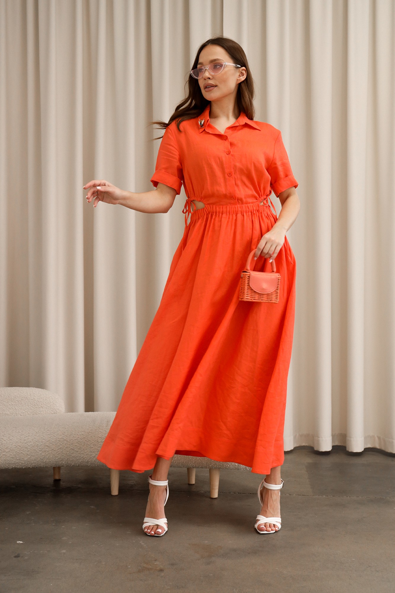 Верхняя часть частично притачана к нижней части платья. По бокам присобрано на кулису с завязкой. Верхняя часть платья с втачным коротким рукавом, прямог силуэта, с отложным воротником на стойке, застежка центральная на петли-пуговицы. Нижняя часть платья присобрана на резинку по талии и с карманами в боковых швах.