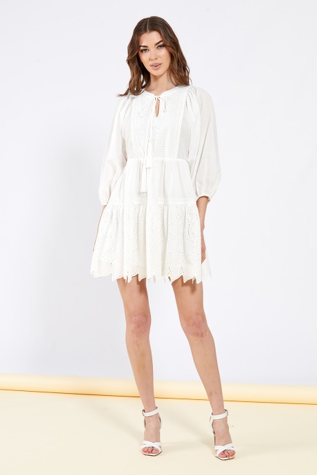 Платье летнее из хлопкового шитья. Свободного А-силуэта, с рукавом реглан из однотона. Платье на подкладке, с воланами. Воротник-стойка с завязками и кисточками по низу. По переду вставка из шитья с кружевом, по линии притачивания рукава присборены. Нижний волан из шитья с отделочной кружевной хлопковой тесьмой. По спике вставка из шитья также с кружевной настрочной хлопковой тесьмой.