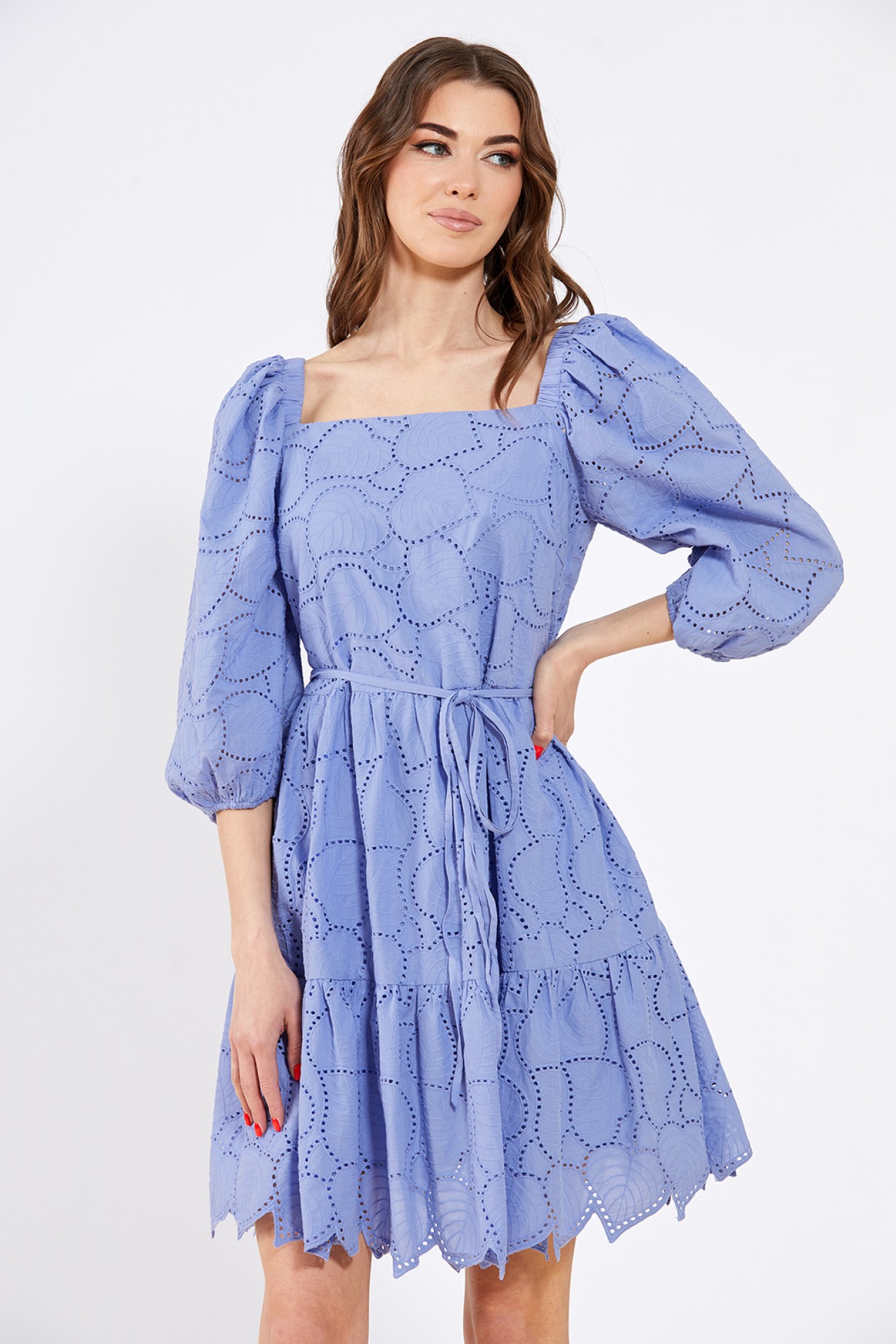 Платье женское, летнее из хлопкового шитья. Свободного А-силуэта силуэта с рукавом-реглан на широких бретелях с резинкой, сборка по шву притачивания к детали с резинкой. Вырез горловины по полочке и спинке каре. По низу два яруса воланов, присобранных по швам притачивания. Платье на подкладке. Низ рукава присобран на резинку. В боковых швах платья пояс-завязки, позволяющие регулировать обьем по талии.
