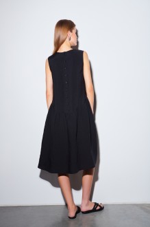 Платье из лёгкой вискозной ткани свободного кроя, с фигурным дугообразным подрезом, без рукавов, горловина округлой формы. Платье длиной ниже линии колена, лиф переда с нагрудными вытачками, спинка с застёжкой на петли и пуговицы по центру. Нижняя часть платья расширена к низу, со сборкой по шву притачивания к лифу. В боковых швах карманы. Платье без подкладки.