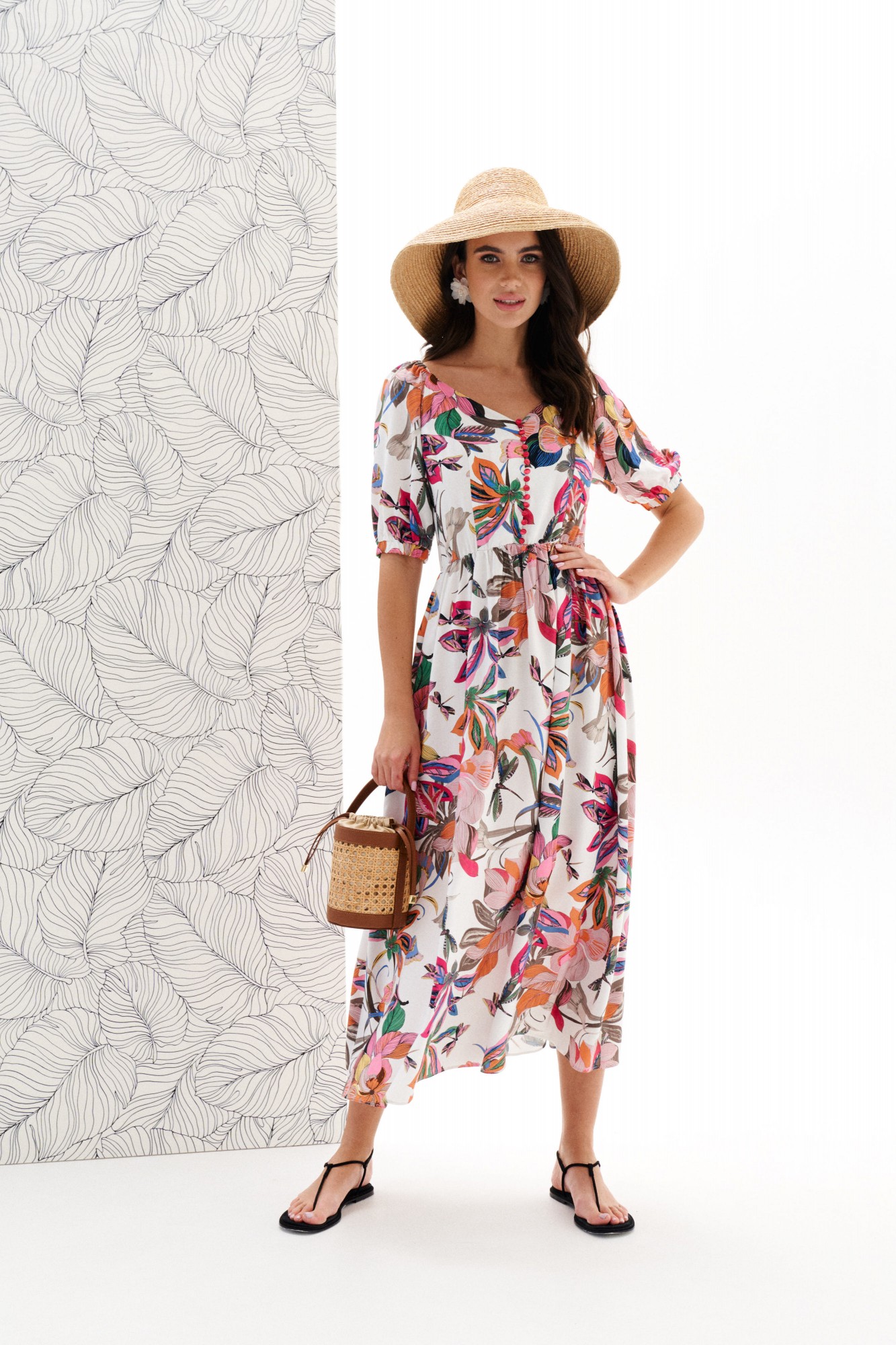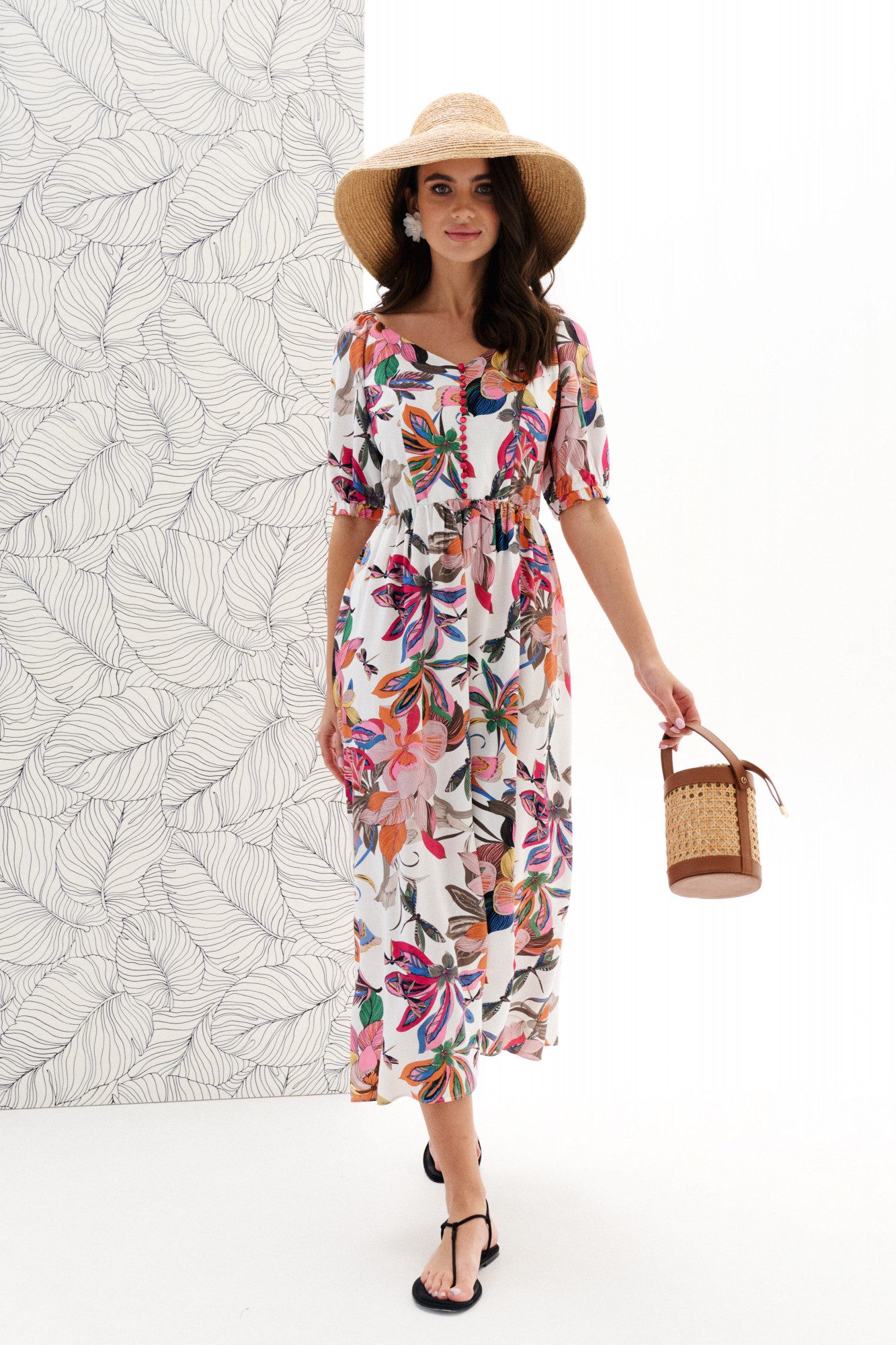 Платье женское, приталенного силуэта, длиной миди из плательной ткани. Отрезное по линии талии. Лиф переда с рельефами и центральной застежкой на навесные петли, пуговицы. Спинка лифа с талиевыми вытачками. Платье с глубоким вырезом, фиксируемым по спинке и верху рукава на резинку. Юбка платья присборена на резинку. Рукав реглан, низ рукава на притачной манжете присборенной на резинку.