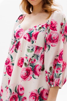 Платье выполнено из плательной ткани с цветочным принтом. Платье А-образного силуэта, длиной выше линии колена, отрезное под грудью. Горловина V-образной формы. Рукав покроя полуреглан со сборкой и эластичной тесьмой по окату, длиной чуть ниже линии локтя. Рукав расширен к низу, присборен и обработан эластичной тесьмой. В боковых швах карманы. В левом боковом шве застежка на потайную молнию. Платье на отлетной по низу подкладке с декоративным кружевом.