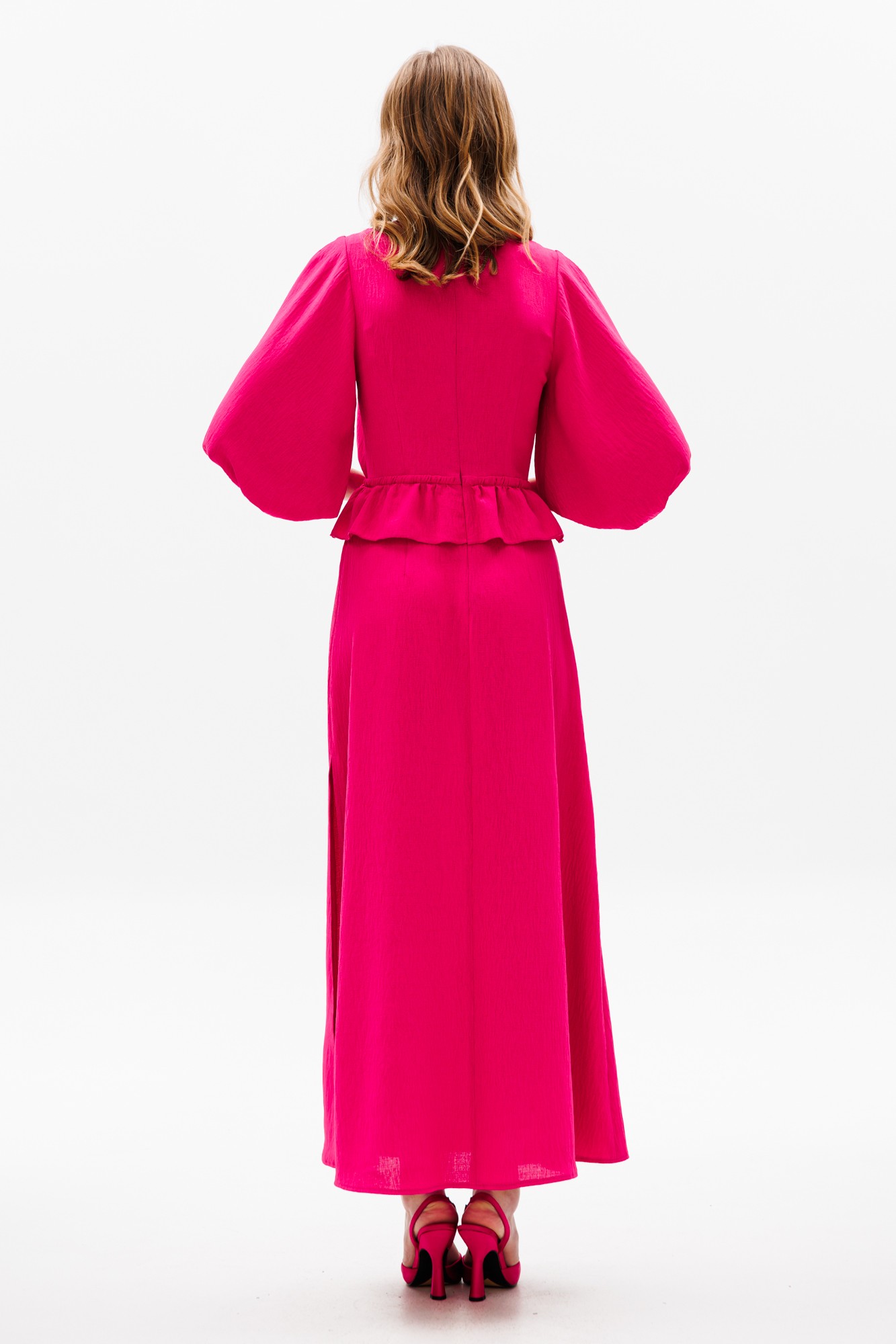 Платье выполнено из плательной ткани. Платье Х-образного силуэта, длиной миди, отрезное по линии талии. Горловина V-образной формы с завязками. На спинке в среднем шве застежка на потайную молнию. Плечевой шов укорочен. Рукав втачного покроя, одношовный, длиной 3/4 с вытачками по окату. Рукав расширен к низу, присборен на эластичную тесьму. Юбка расширена к низу. На заднем полотнище средний шов. В левом боковом шве обработан разрез.