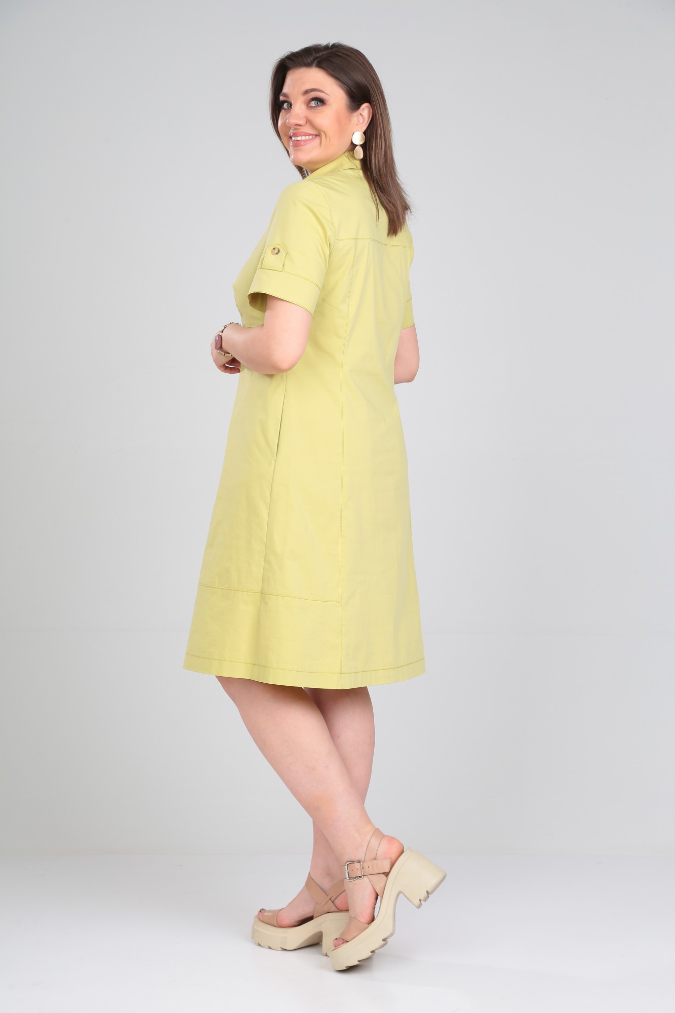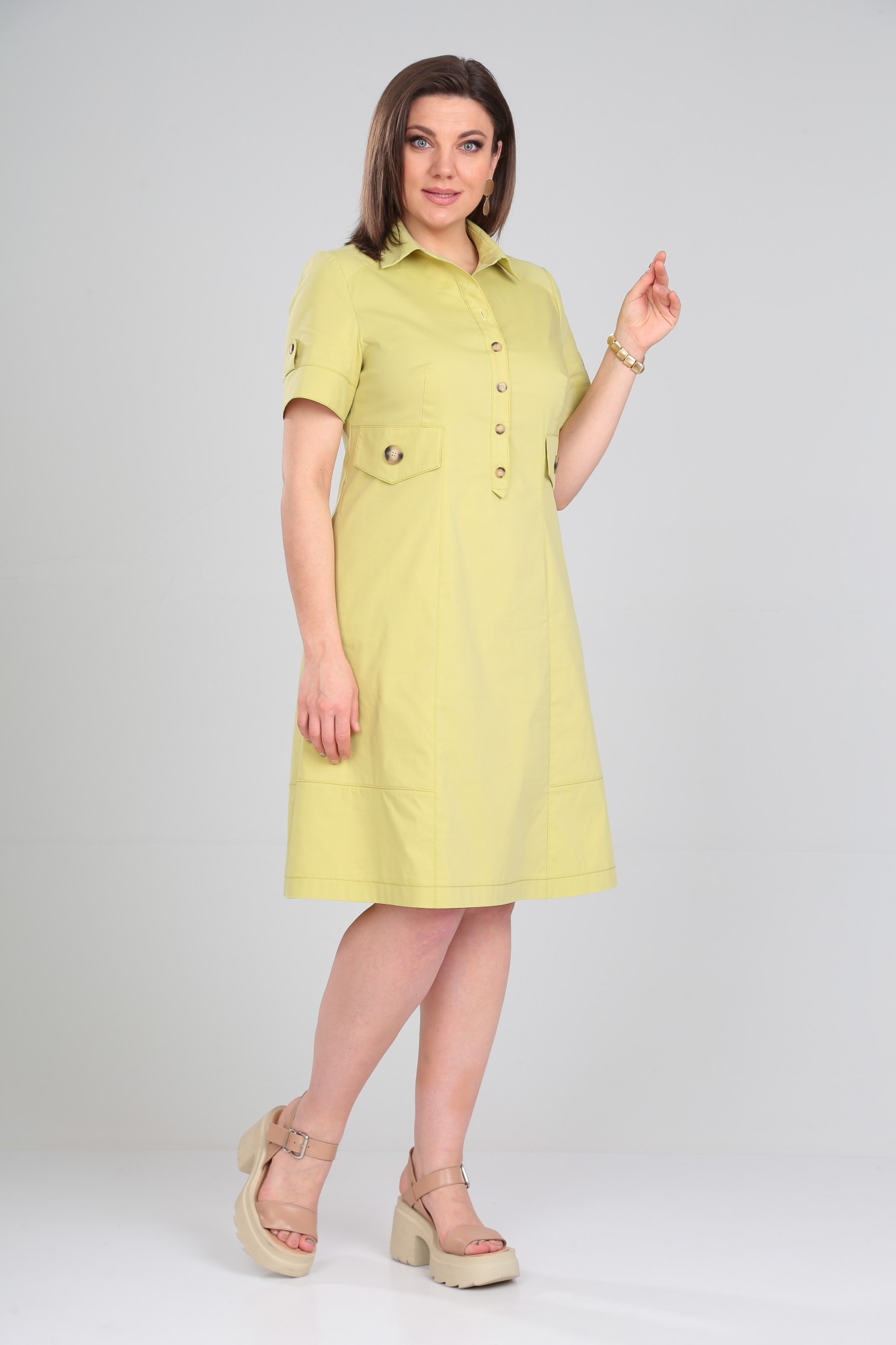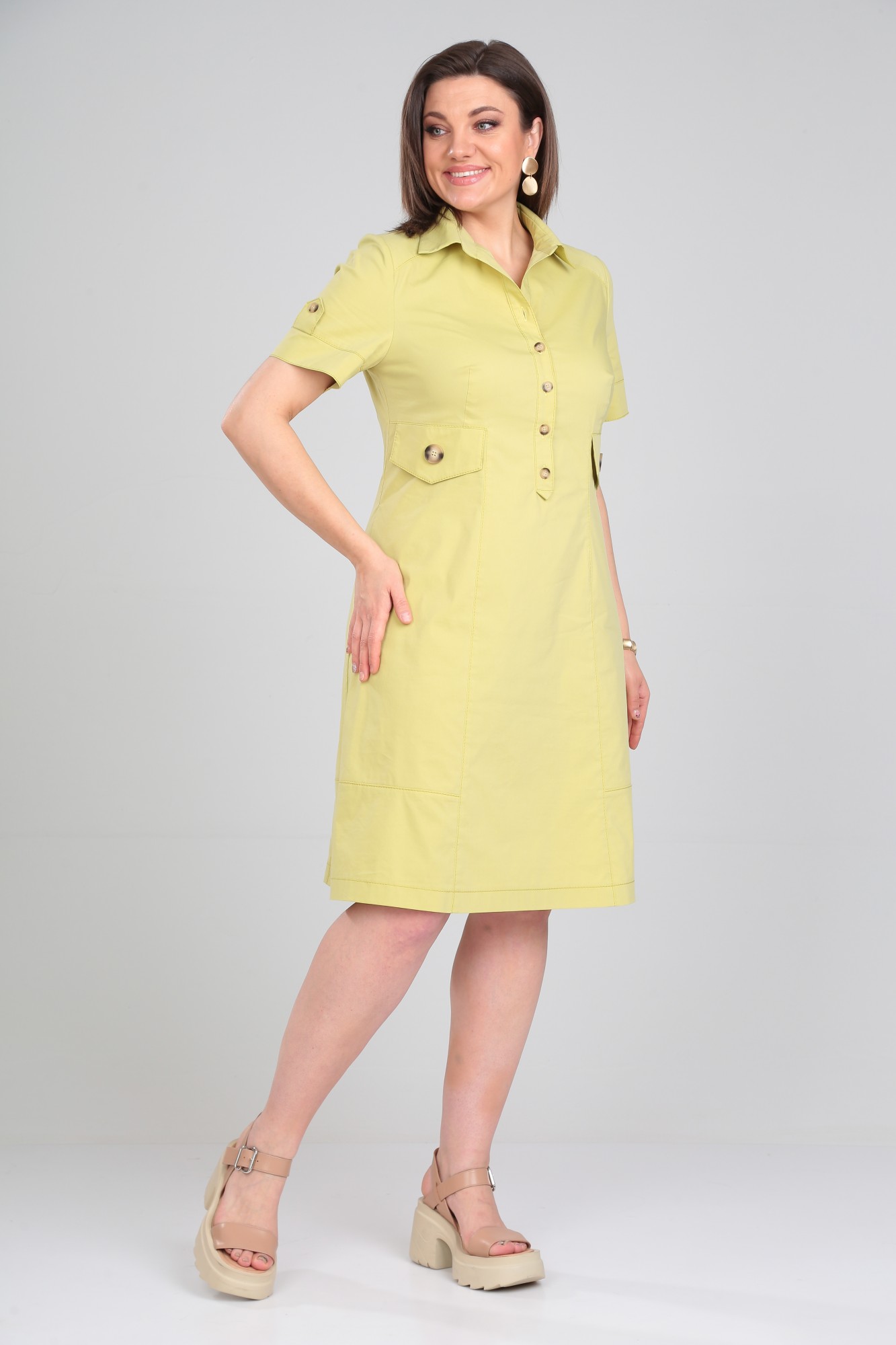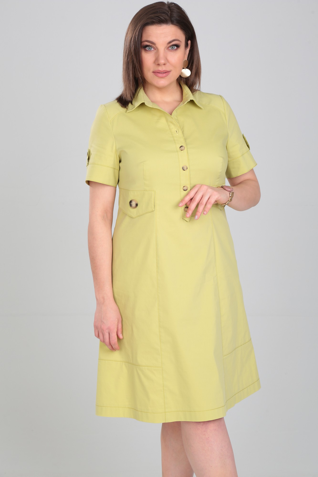 Платье женское втачного покроя, А-силуэта, воротник рубашечный с застежкой на планку до линии талии. В боковых швах карманы. На полочке кокетка, фигурные рельефы и клапаны. По спинке кокетка и вертикальные рельефы. Короткий рукав с отрезной манжетой и патой.