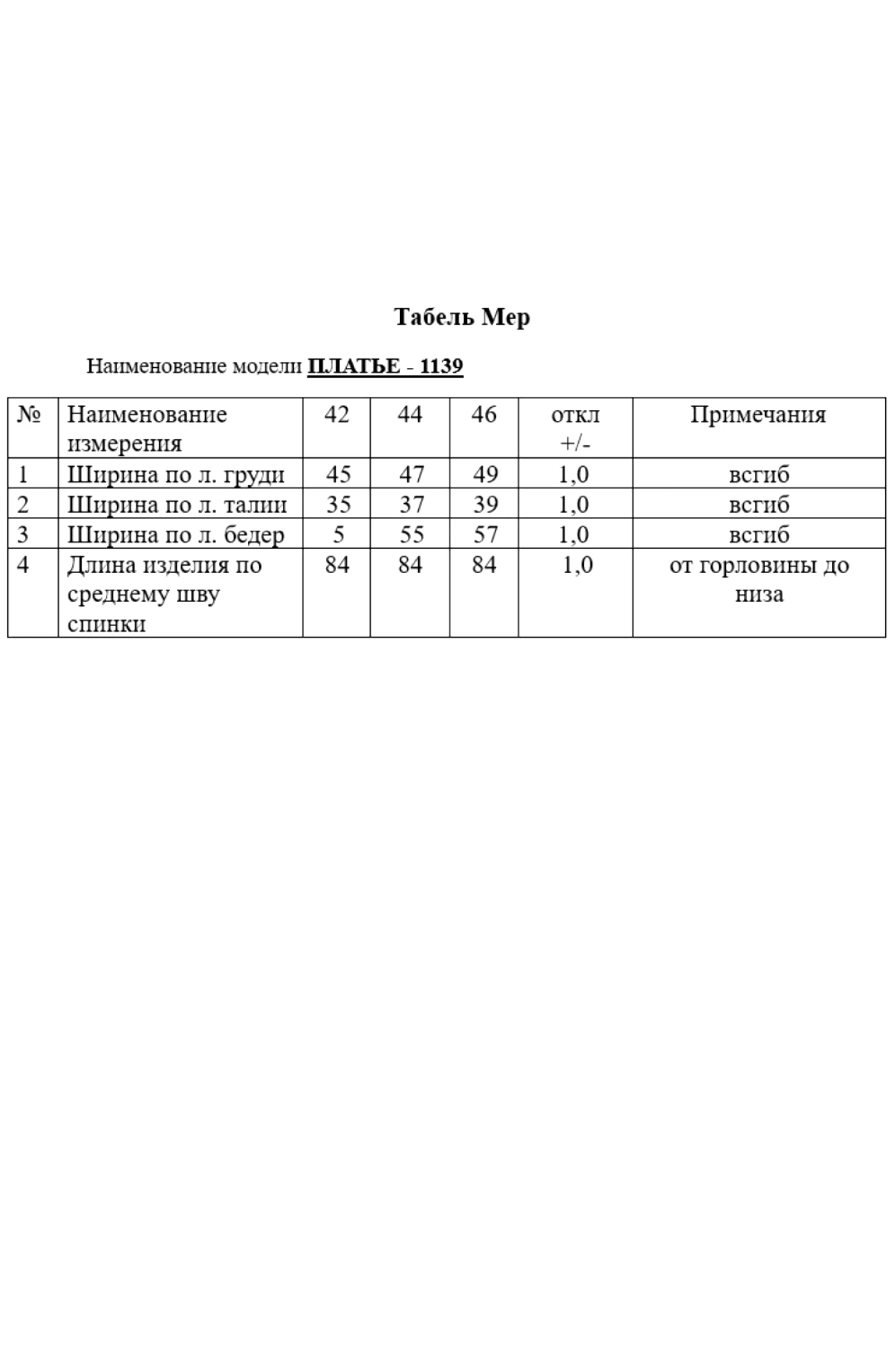 Таблица размеров