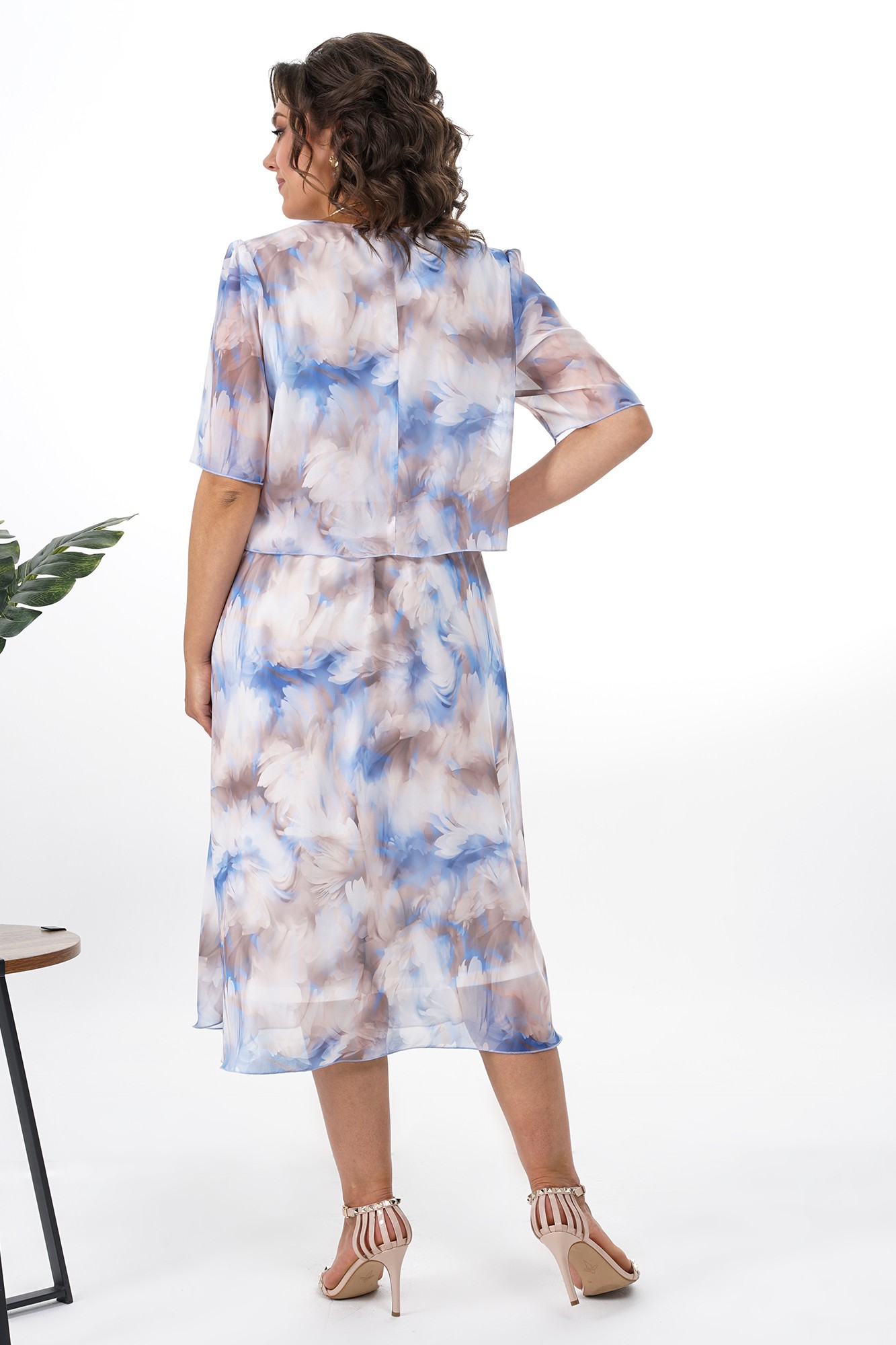 Платье женское на подкладке, отрезное по линии талии собранное на резинке, верхняя часть отлетная по низу. Перед с нагрудными выточками. Спинка верхняя часть со средним швом. Рукава втачные, одношовные, короткие, по окату со сборкой. По горловине переда небольшая сборка.
