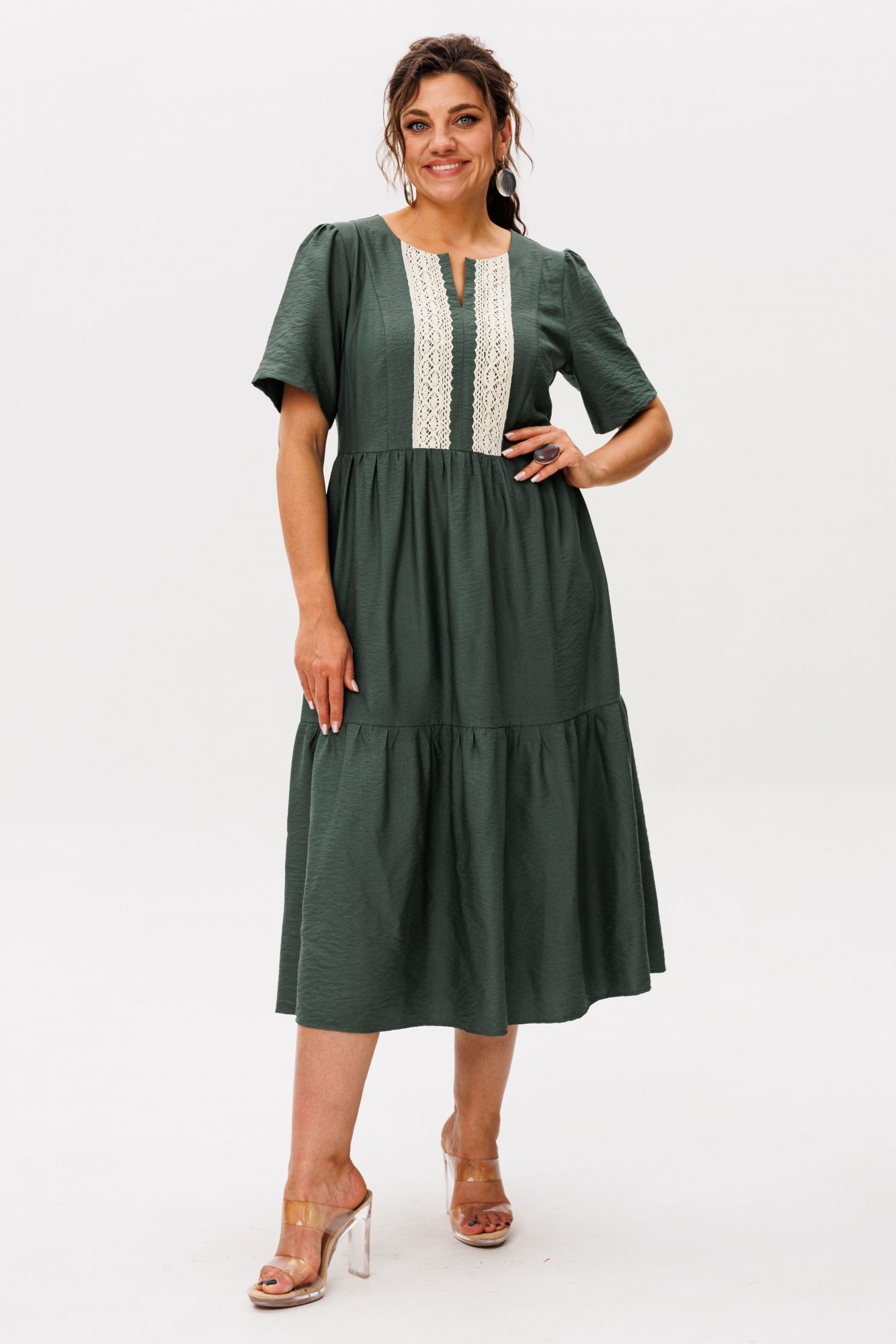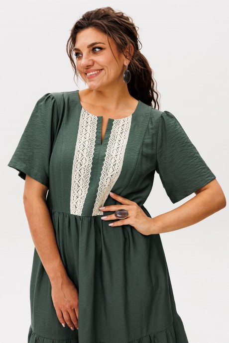 Воздушный силуэт, струящийся по фигуре, мягко подчеркивает линии, даря свободу и легкость. V-образный вырез в обрамлении округлой горловины добавляет изящный акцент, а игра воланов оживляет каждый шаг. Короткие рукава и удобные карманы вписаны так естественно, что кажутся частью образа, а не просто деталью. И завершающий штрих — нежное кружево, придающее наряду тонкую романтичность