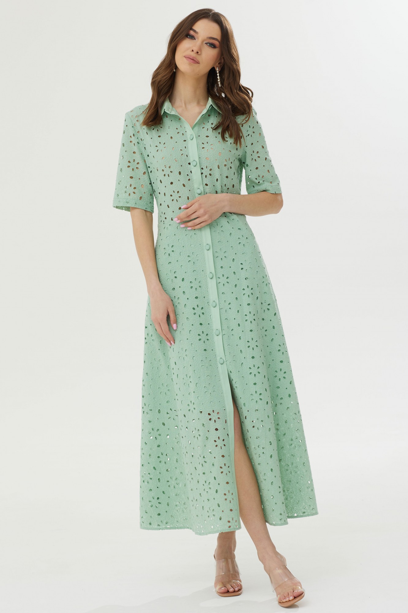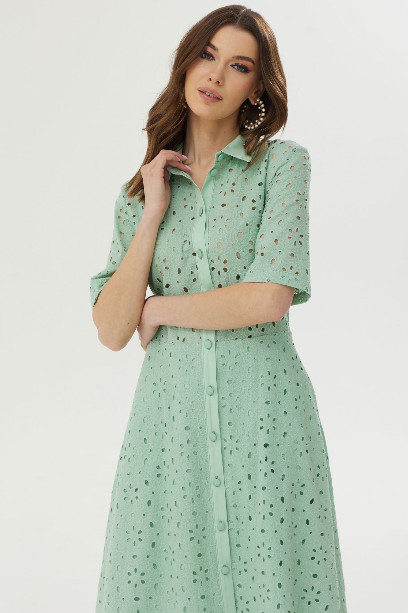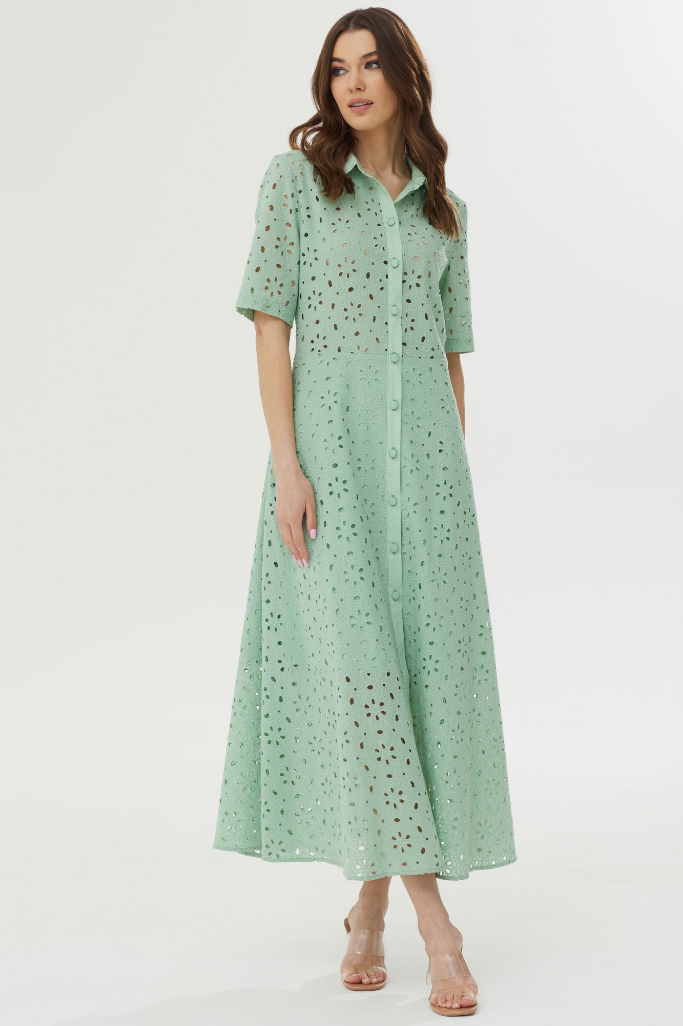 Стильное платье полуприлегающего силуэта расклешенное книзу из ришелье. Воротник рубашечного типа с застежкой на петли и пуговицы. Рукав втачной короткий. Перед и спинка отрезные по линии талии. Платье частично на подкладке. В боковых швах функциональные карманы. Обращаем ваше внимание на то, что фурнитура может незначительно отличаться от фото.