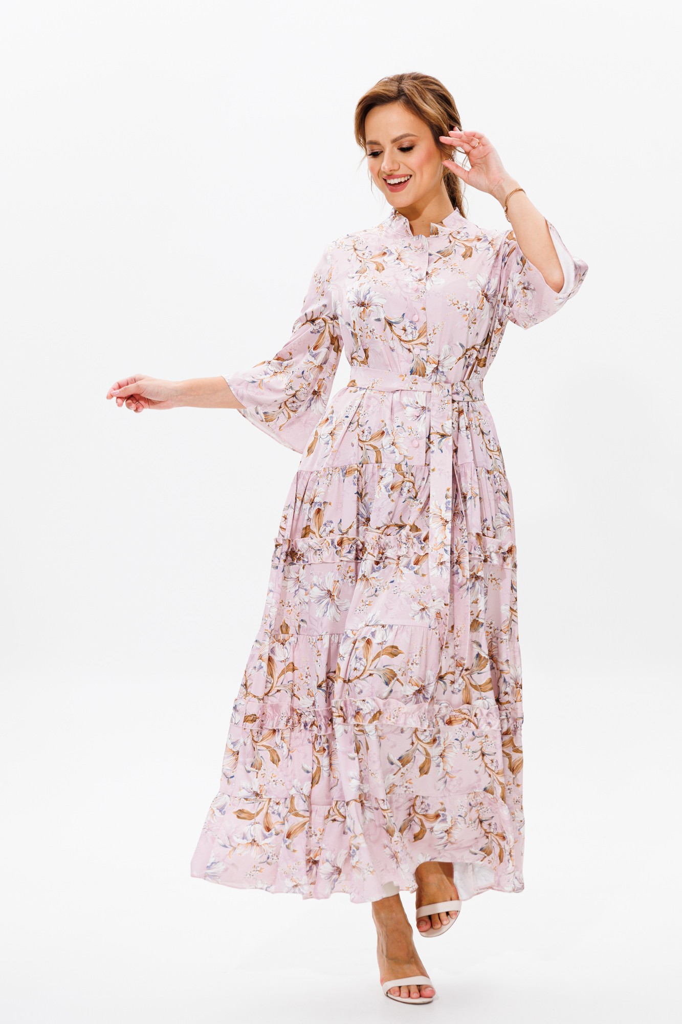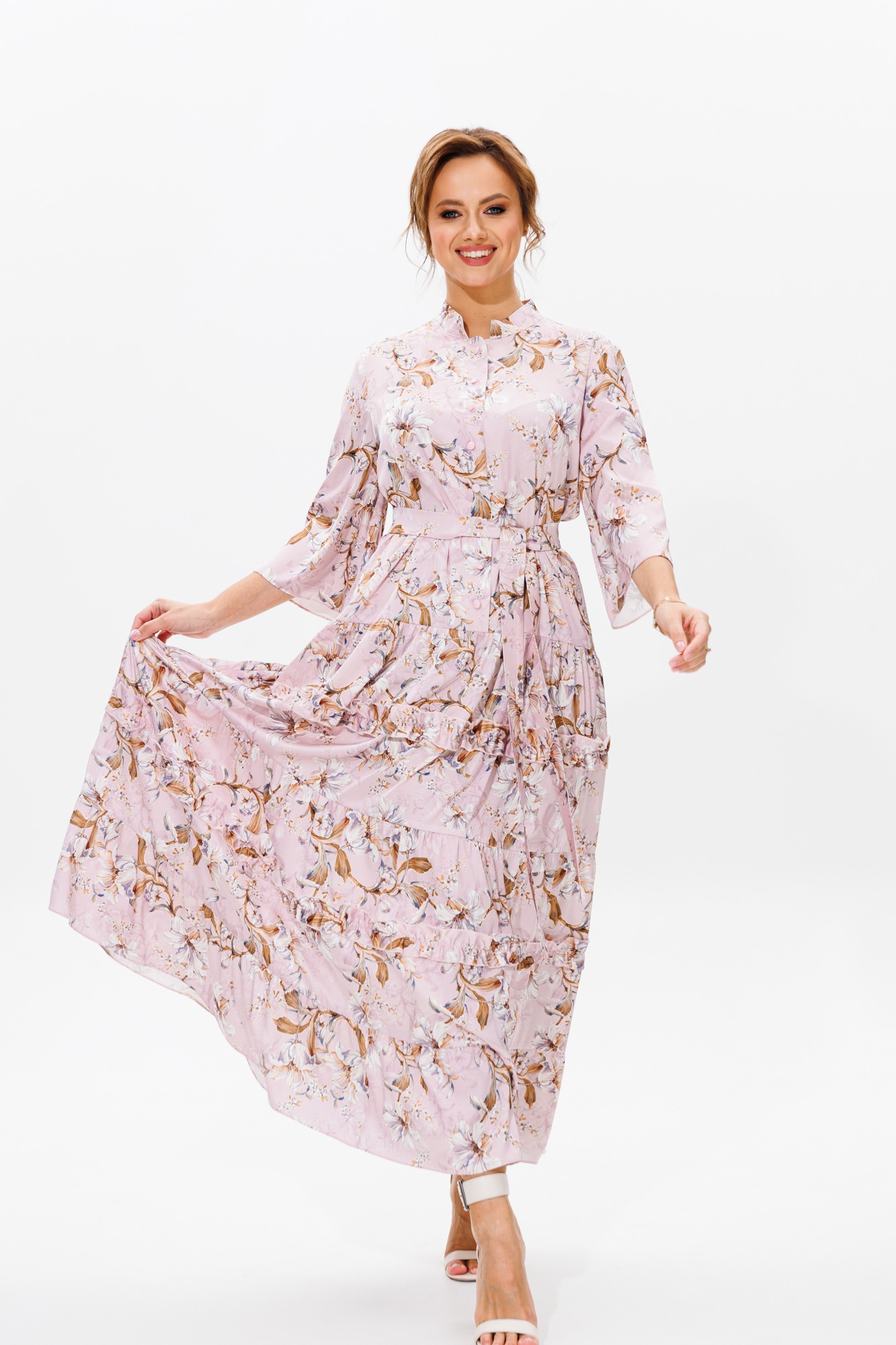 Нарядное женское платье, выполнено из лёгкого струящегося атласа (тянется). Платье отрезное ниже линии талии. Верхняя часть переда с центральной застежкой на петли и пуговицы. Горловина оформлена стойкой. Нижняя часть платья А-образного силуэта, состоящая из трех воланов, декорированных рюшами из основной ткани. Рукава втачные одношовные, расширенные к низу.