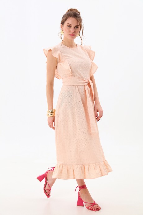 Платье прилегающей силуэтной формы, отрезное по линии талии, с застёжкой-молнией в боковом шве. Верхняя передняя часть платья и спинка с рельефными швами и отделочными воланами, переходящими в рукав-крылышко. Передняя и задняя части юбки с рельефными швами и оборкой по нижнему срезу. Вырез горловины и срезы пройм окантованы бейками. Линия талии платья подчёркивается длинным поясом, завязывающимся на бант.
