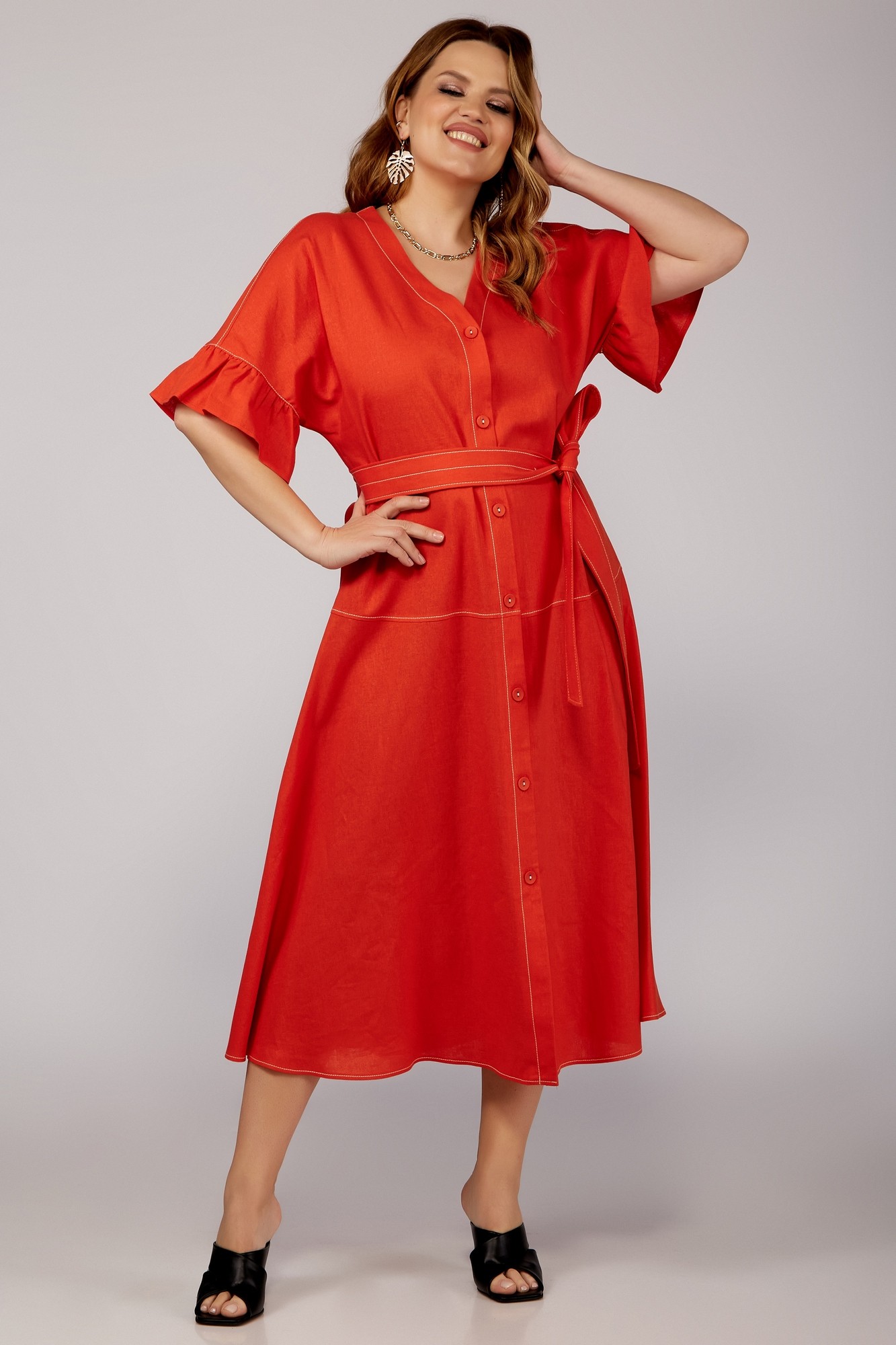 Платье женское свободного силуэта, со спущенной линией плеча, с центральной сквозной застежкой на 7 петель и 7 пуговиц, длиной до середины икр, со съемным поясом. Лиф детали спинки платья со средним швом. Рукава цельнокроеные, короткие, с притачными «рюшами», по шву соединения обработана сборка.