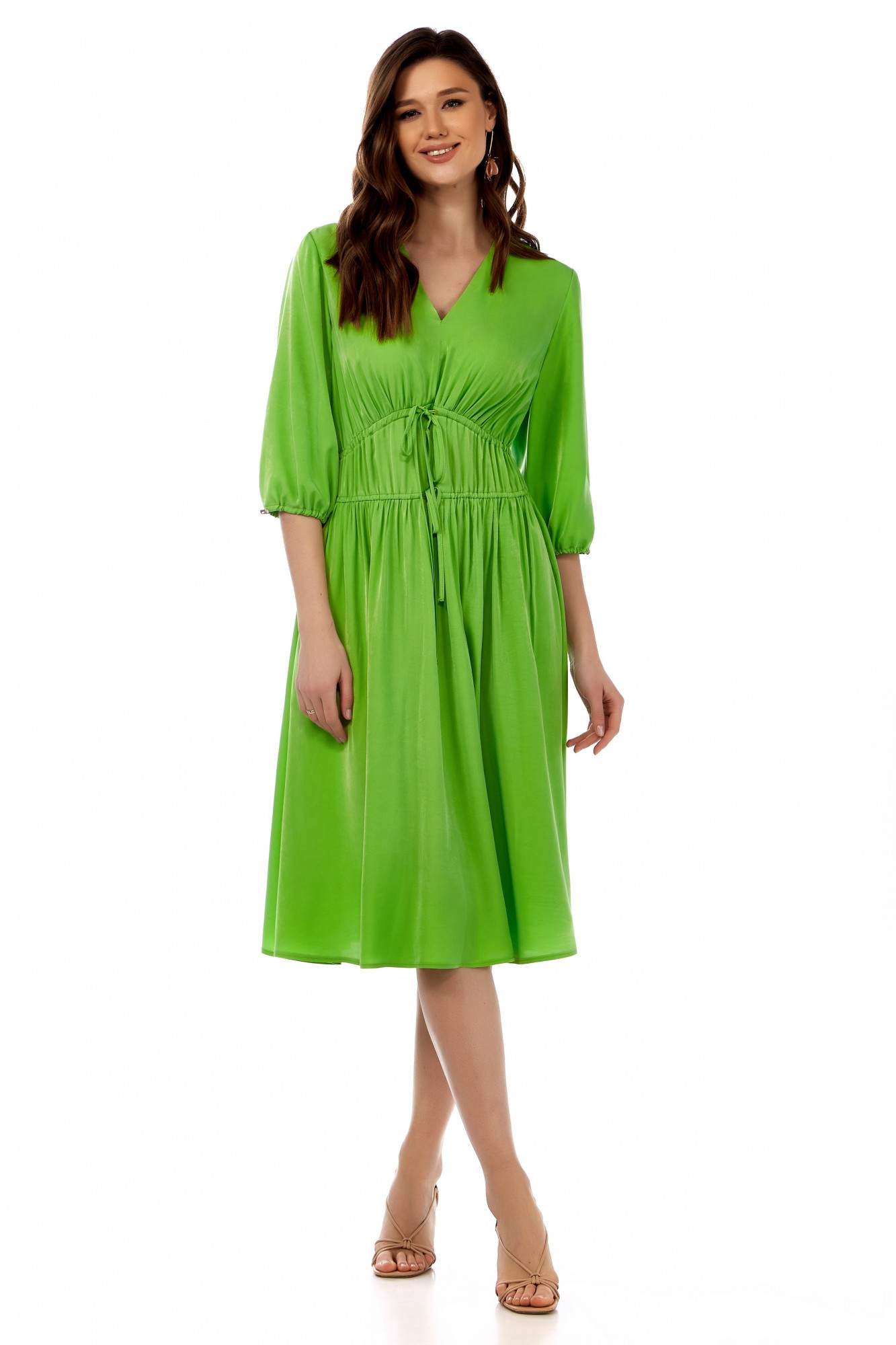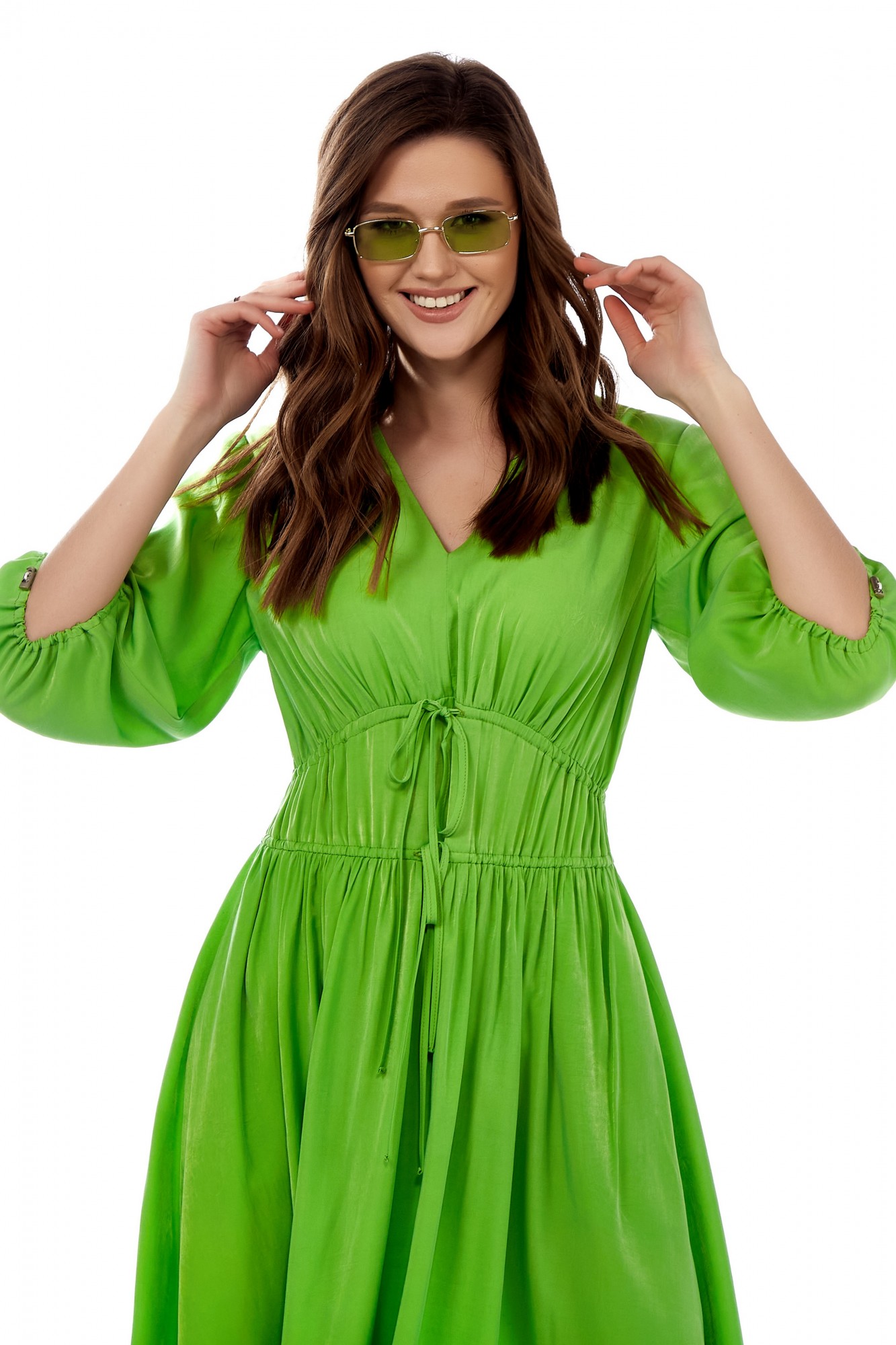 Платье свободного силуэта, расширенное книзу, с втачным поясом на уровне линии талии, в боковых швах обработаны карманы. Деталь лифа переда платья со средним швом. Платье с втачным поясом на уровне линии талии, в который вставлена эластичная тесьма по спинке, по переду втянут шнур. По переду пояс фигурной формы. Рукава втачные одношовные, длиной до локтя, по низу собраны на эластичную тесьму.